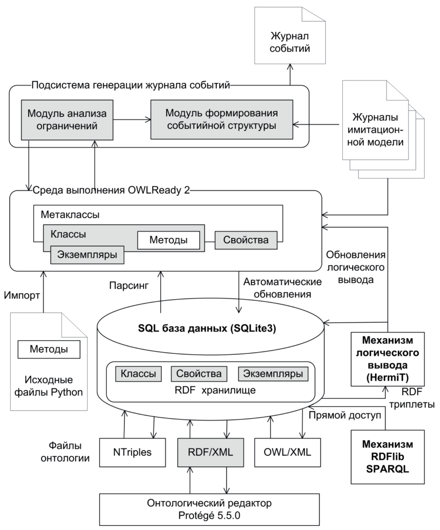В основе подсистемы онтологического моделирования находятся: библиотека OWLReady 2, RDF-хранилище, реализованное с помощью SQL-базы данных SQLite 3, механизм логического вывода HermiT. Среда выполнения OWLReady 2 позволяет оперировать классами (понятиями) онтологии, экземплярами (индивидами) и свойствами. Указанные структуры сохраняются в RDF-хранилище [5-7]. Реализация данной подсистемы позволяет выполнять сохранение онтологии в формате RDF/XML [8] с последующей загрузкой в редактор Protege. Выполнение логического вывода возможно как непосредственно в среде OWLReady, так и средствами онтологического редактора.