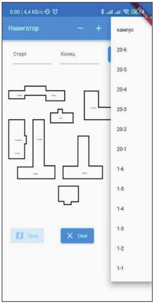 На рисунке 4 приведён пример выбора начальной точки маршрута. В интерфейсе предусмотрен выпадающий список, из которого пользователь может выбрать нужную карту для отображения. Результат записывается во врѐменную переменную, описанную в логической архитектуре, и передаётся в класс для отображения. Пример выпадающего списка представлен на рисунке 5.