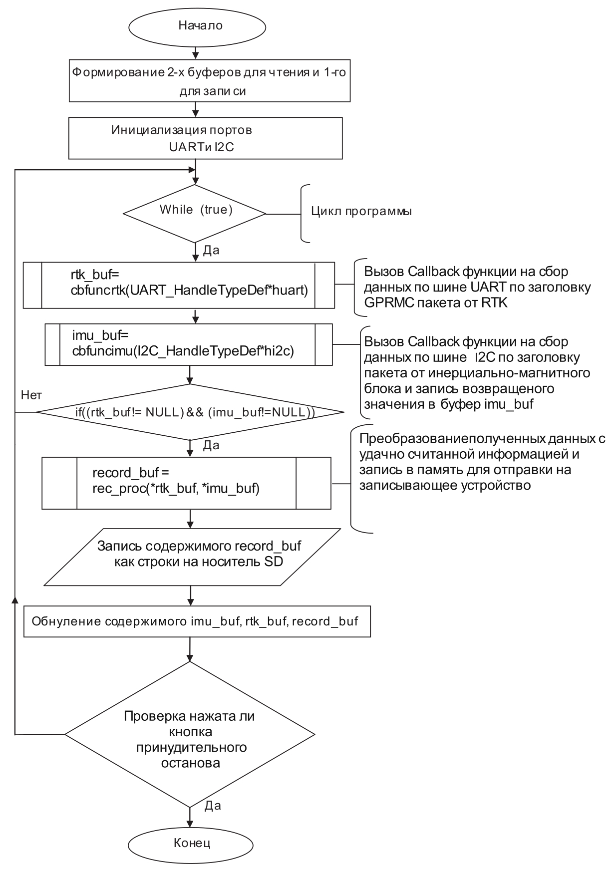 В бесконечном цикле последовательно считываются данные из шин I2C и UART (см. рисунок 1) с помощью функций cbfuncrtk и cbfuncimu (см. рисунок 2). Результатом является запись в буферные структуры. Если обе структуры были удачно записаны, то данные передаются функции rec_proc для преобразования в выходной формат, после чего производится запись на внешний носитель.