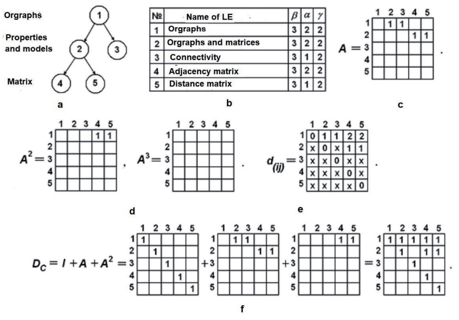 Figure 1 – Example of a content model: a – content graph; b – specification of LE attributes; c – the matrix of adjacency of CG; d – the degree of the adjacency matrix CG; e – the distance matrix of the CG; f – CG achievability matrix