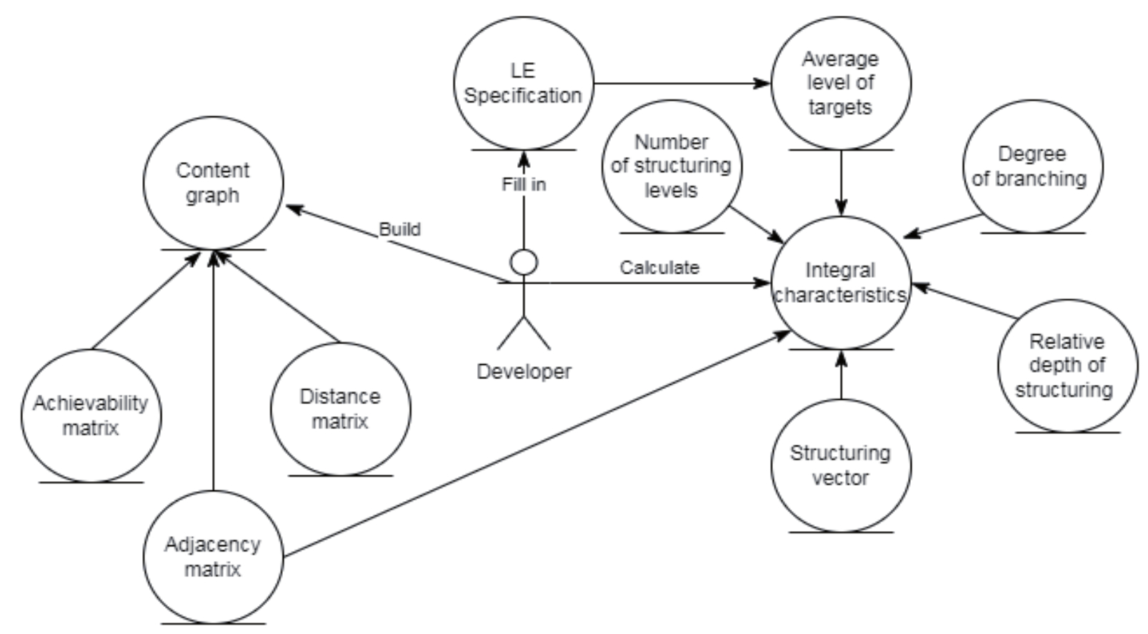The algorithms discussed above make it possible to automate the process of preparing a content model [19]. The EER developer creates a set of LE in dialogue with the computer and establishes hierarchical relationships between them, filling in the values of the target indicators in the specification of the LE attributes. The computer program controls the structure of the CG, according to the rules of its construction, visualizes the CG, forms matrices of adjacency, reachability and distances, calculates the integral characteristics of the content model, forms the table of contents of the educational material for its export to the EER layout tool program (Figures 4, 5)1.
