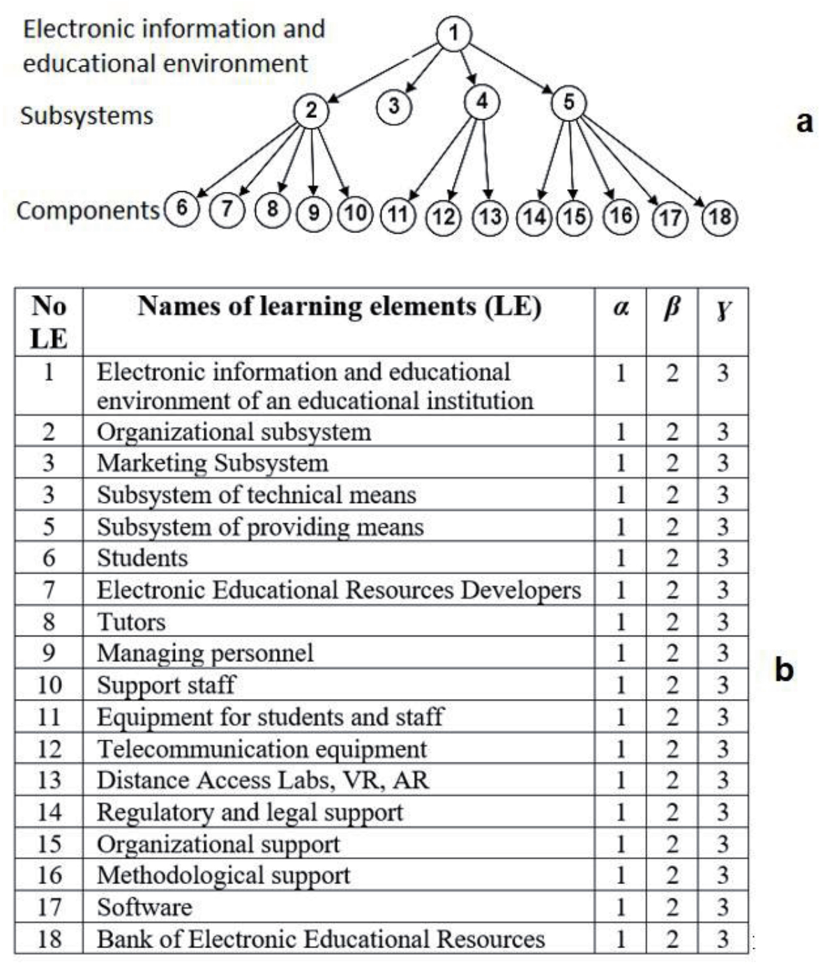 Figure 6 – Content model of the Electronic information and educational environment of an educational institution topic: a – content graph; b – specification of learning elements attributes