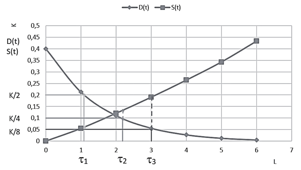 В примере постулированы зависимости D(t), S(t), описанные в примере 2. Заданному значению S* соответствует t*, представленное на рисунке 8. Этому значению t* соответствует показатель D(t*), указанный на оси ординат.