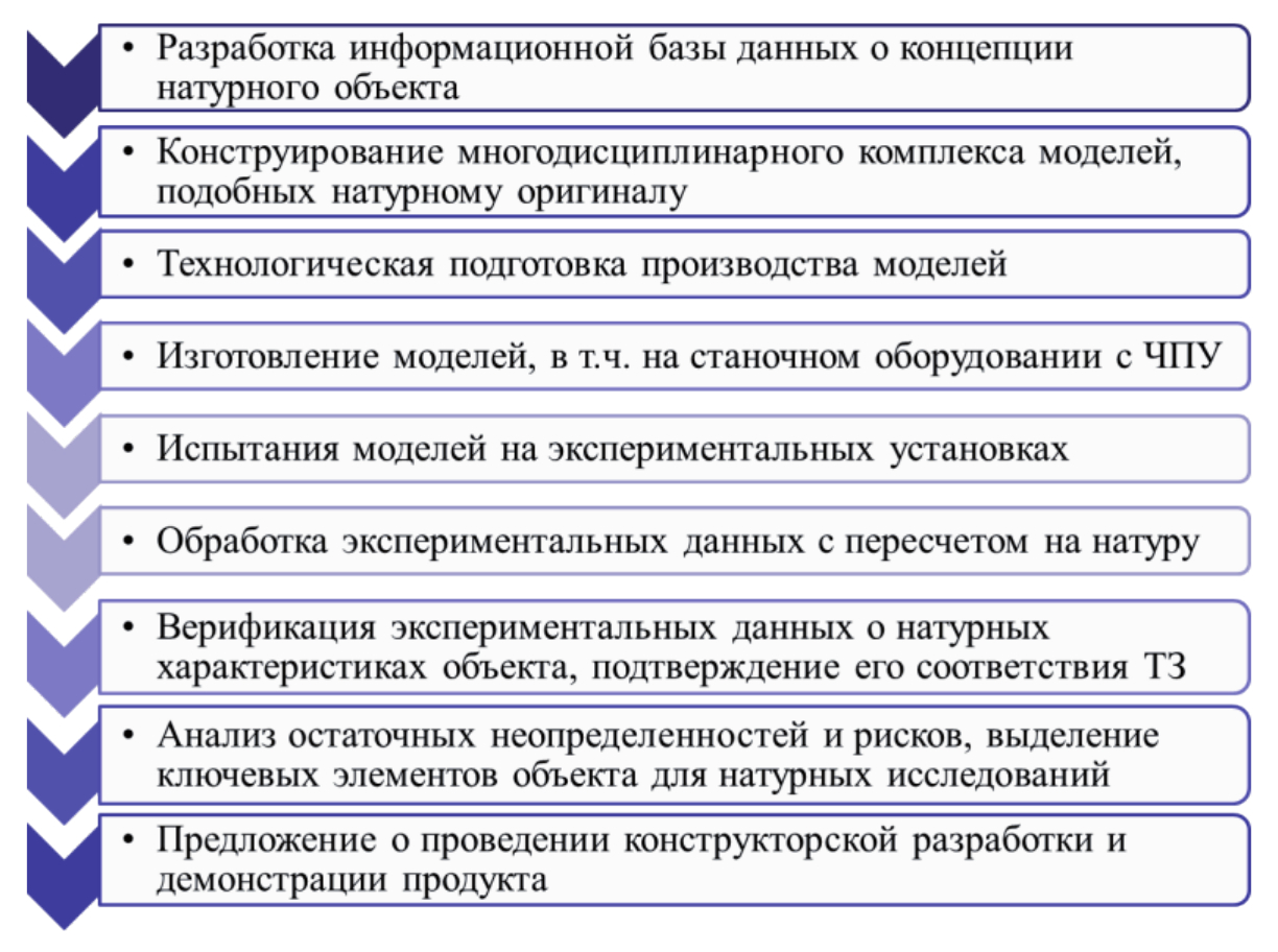 Созданные на Этапе 3 электронные чертежи и твёрдотельные модели сборки используются в конструировании и производстве моделей [15, 16]. Комплекс моделей, созданный на основе принципов подобия [17], служит для проведения экспериментов в соответствии с методиками и программами испытаний. Результаты экспериментальных и расчётных исследований используются для подтверждения проектных данных.