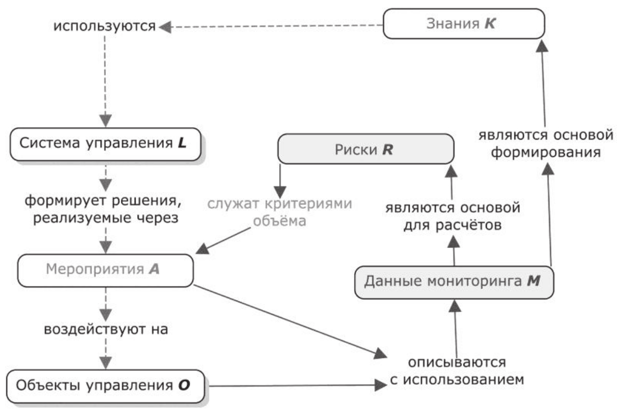 Концептуальный уровень описания предметной области представлен в виде онтологии (рисунок 1). Основные элементы онтологии – система управления L и объекты управления О логически связаны через мероприятия А, реализующие принимаемые решения. Система мониторинга М консолидирует характеристики О и их изменения. В результате формируется информационная база для оценивания рисков и формирования знаний. Сплошные стрелки указывают на потоки данных. Связь сущностей таблиц, содержащих характеристики объектов O и мероприятий A, данные мониторинга M и результаты оценки рисков R, реализуется через системообразующие элементы (справочники, реестры). Например, вид ситуации и её локализация позволяют сформировать сценарий реагирования, задействованные ресурсы и ожидаемые результаты. Пунктирные стрелки показывают использование для связывания данных логических правил «Если…, То…».