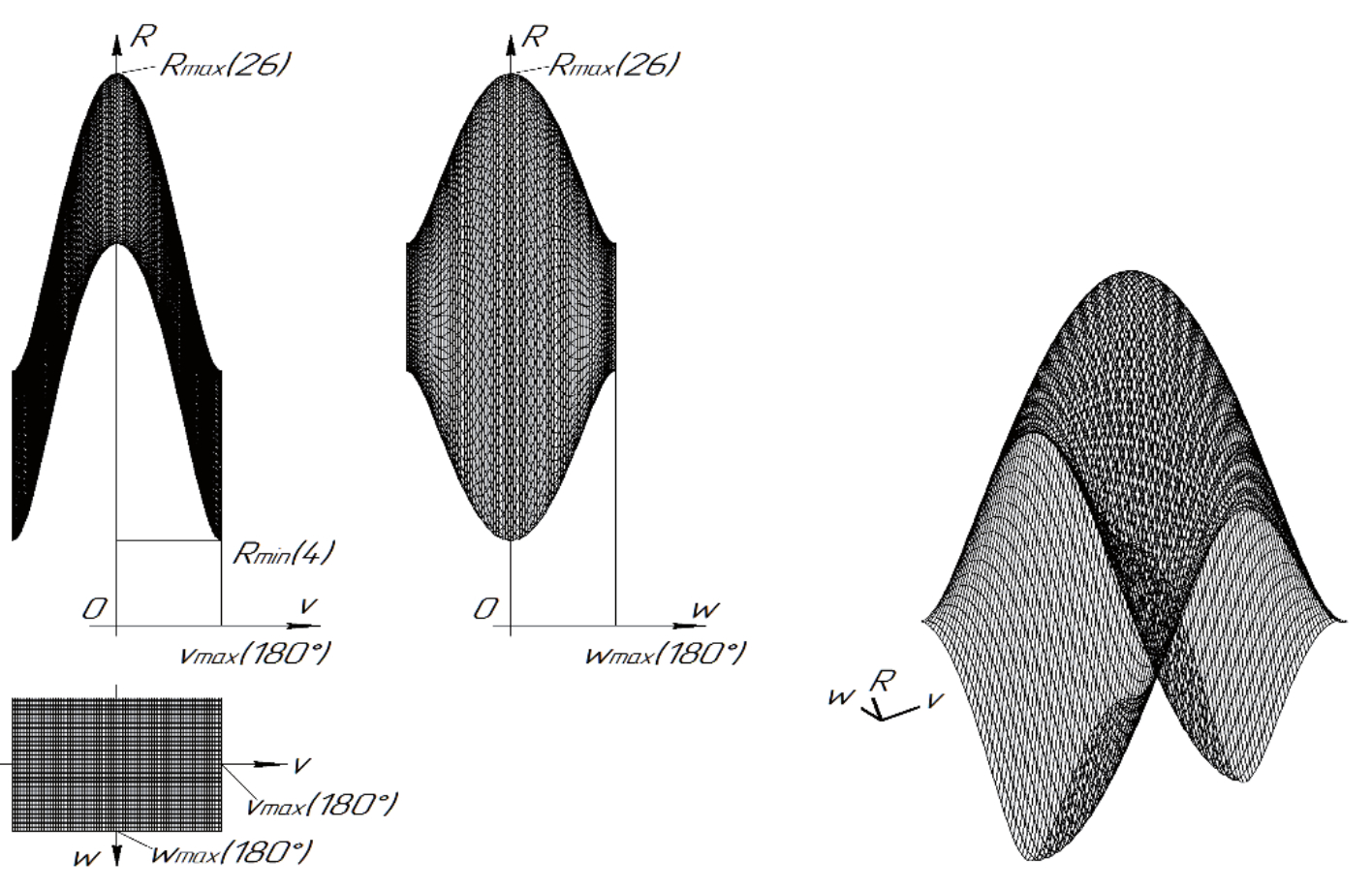 Рисунок 7 - Каркасные модели V- поверхностей для u=0°, 90°, 180°