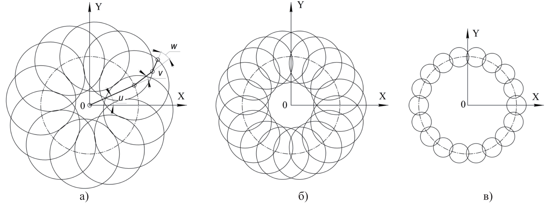 Для каждого фиксированного значения u предлагается рассматривать семейства окружностей на плоскости (рисунок 3) как проекции окружностей некоторого многообразия из четырёхмерного пространства [17, 18]. Пусть каждая из окружностей этого семейства смещена параллельно гиперплоскости XY на величину, пропорциональную параметрам v и u. Тогда семейство таких окружностей записывается уравнениями: