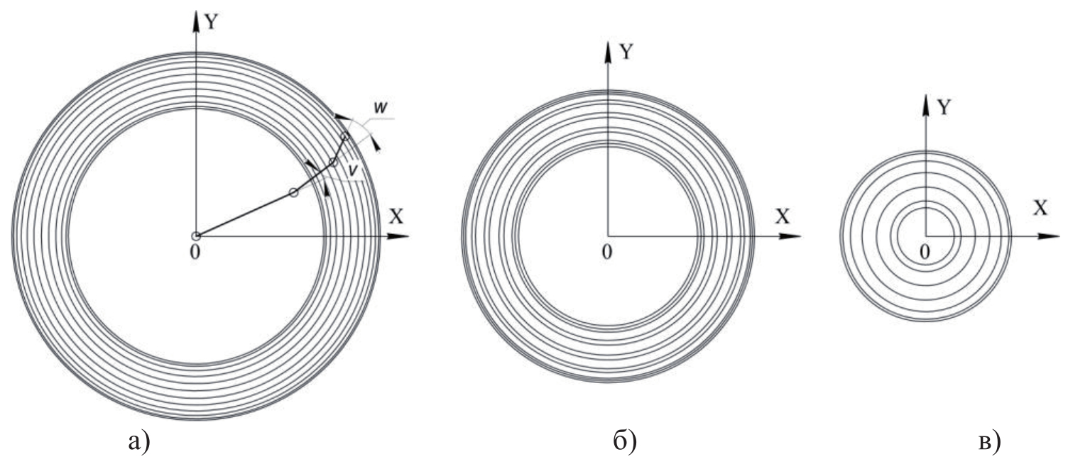 Рисунок 6 – Семейства концентрических окружностей для различных значений параметра v: а) v=0°, б) v=90°, в) v=180°