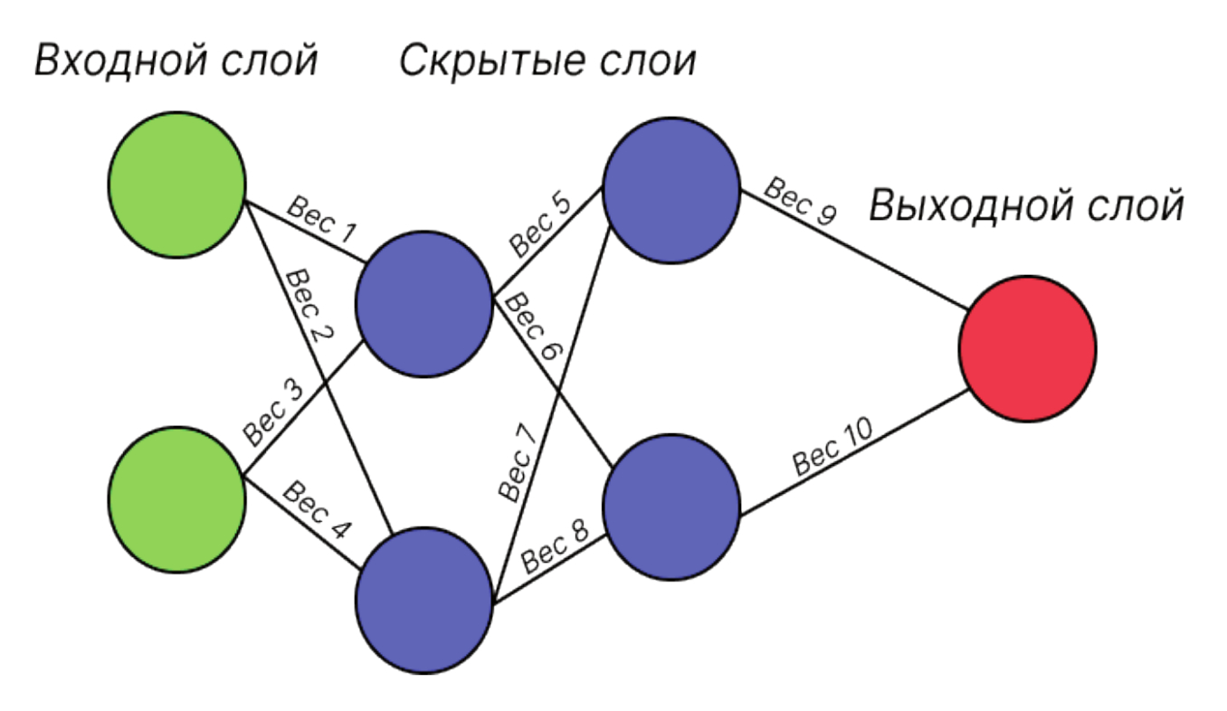 - скрытый – обрабатывает информацию и может состоять из нескольких скрытых слоёв, количество которых зависит от сложности задачи;