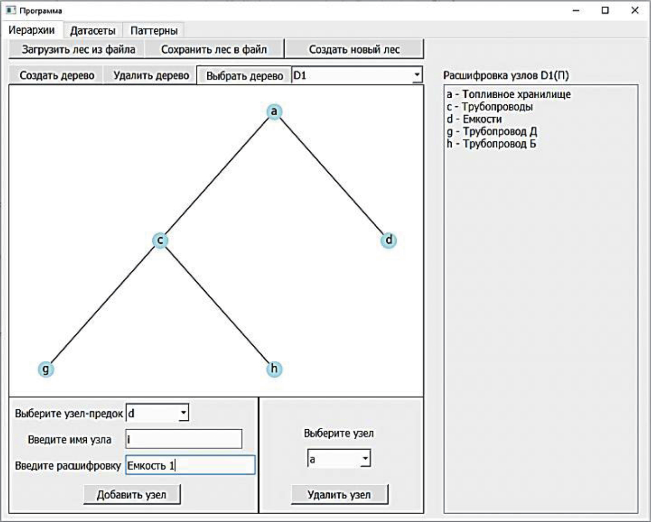 Признаковое пространство представляет собой множество деревьев (лес) признаков, каждое из которых упорядочивает признаки в определённую партономию, либо таксономию. На вкладке «Иерархии» с помощью кнопок «Создать новый лес», «Загрузить лес из файла», «Сохранить лес в файл» обеспечена возможность создания нового признакового пространства, загрузки признакового пространства из файла, сохранения его в файл, соответственно. После именования признакового пространства можно создавать, удалять, редактировать деревья признаков с помощью кнопок второй линейки верхней панели. На рисунке 4 показана процедура редактирования дерева. Деревья признаков отображаются на вкладке слева. При необходимости добавления в дерево признаков новых узлов в соответствующие поля внизу экрана вводится идентификатор узла-предка, для которого следует добавить узел-потомок, а также идентификатор и текстовое пояснение для добавляемого узла-потомка. Обеспечена возможность каскадного удаления узлов в деревьях.