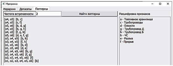 На рисунке 6 представлен этап получения результирующих паттернов. На вкладке «Паттерны» в специальном окошке задаётся порог частоты встречаемости искомых паттернов в обучающей выборке. С помощью кнопки «Найти паттерны» запускается поиска частых замкнутых паттернов с учётом иерархий признаков. Результаты поиска представляются в левой части экрана в виде пар множеств «транзакции (объекты), поддерживающие частый замкнутый паттерн – сам искомый паттерн». Выводятся все замкнутые паттерны, которые удовлетворяют заданным требованиям к частоте встречаемости и ограничениям на иерархии признаков.