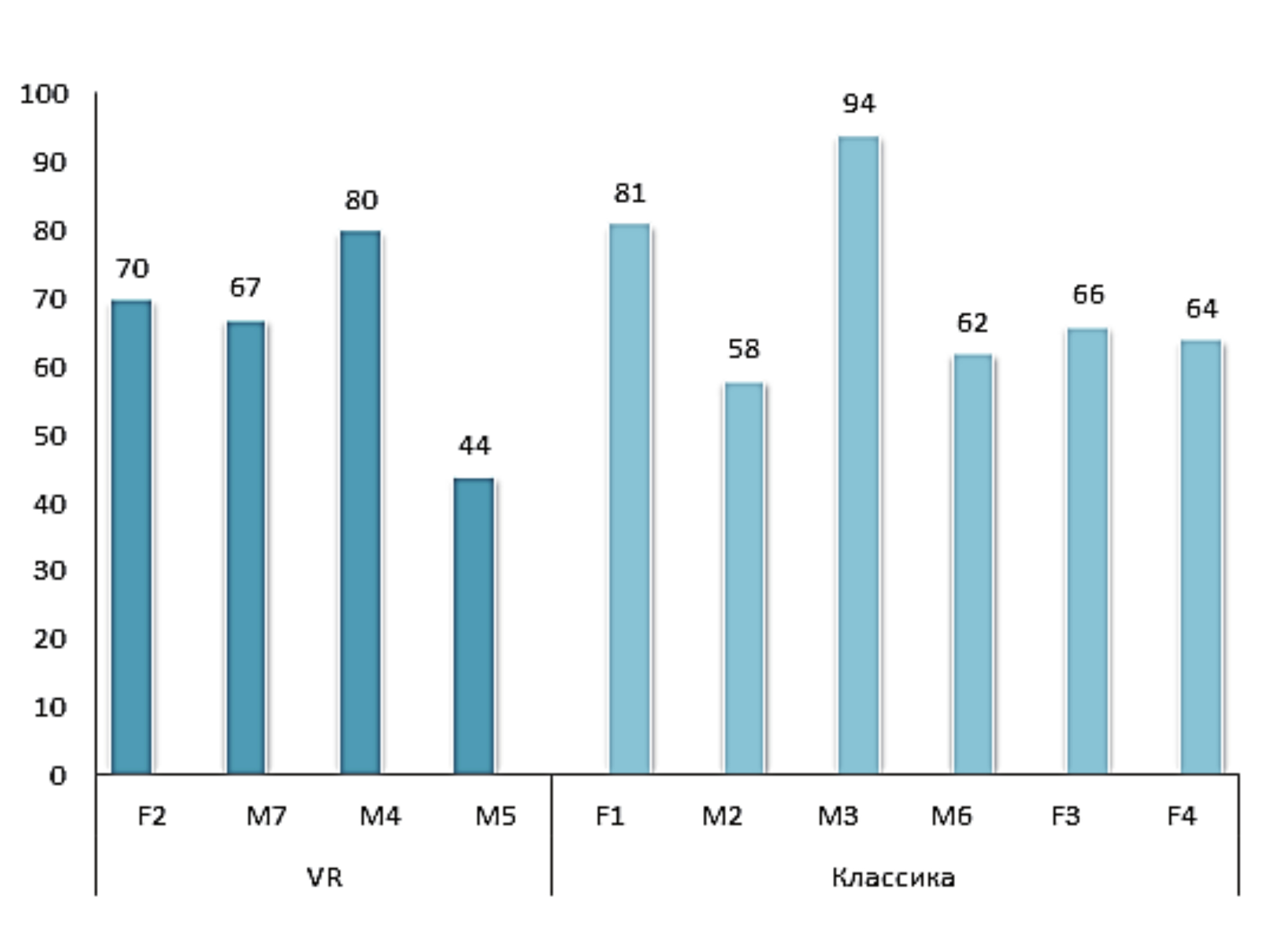 В работе приводятся результаты начального этапа исследовательских работ. Для окончательных выводов пока недостаточно располагаемого объёма достоверных данных. Этим обстоятельством может объясняться существенное различие между представленными результатами и полученными в работах [15-16]. В статье сделана попытка сравнить два подхода с точки зрения подачи разнотипной учебной информации, выявляя их сильные и слабые стороны, с целью составления в будущем обоснованных рекомендаций для методистов-интеграторов электронных образовательных сред по соотношению классических и ВР-подходов в перспективной системе подготовки обучающихся. Учитывая небольшой исходный объём данных, приведённые результаты носят предварительный характер (рисунок 7). Целесообразно учитывать общую успеваемость обучающегося, что позволяет понять, является ли итоговый балл следствием влияния концепции обучения или же это отражение общего уровня знаний и личностной организации студента5.