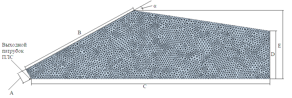 Рисунок 3 – Схема моделируемого пространства с разбиением на ячейки расчётной сетки. A – длина задней стенки моделируемого пространства, смежной с выходным патрубком ПЛС, B – длина верхней стенки моделируемого пространства на начальном участке струи, С – длина моделируемого пространства, D – высота передней стенки моделируемого пространства, E – максимальная высота моделируемого пространства, α – угол возвышения выходного патрубка ПЛС.