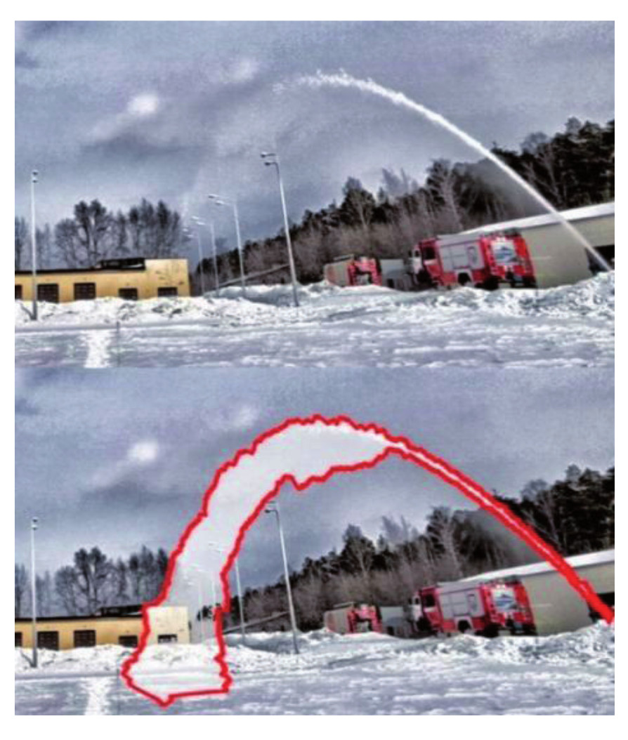 В верхней части рисунка 5 представлен фрагмент цифровой фотографии потока огнетушащего вещества после предварительной обработки, а в нижней – после выделения верхней и нижней границ на базе методики [17] и её программной реализации.