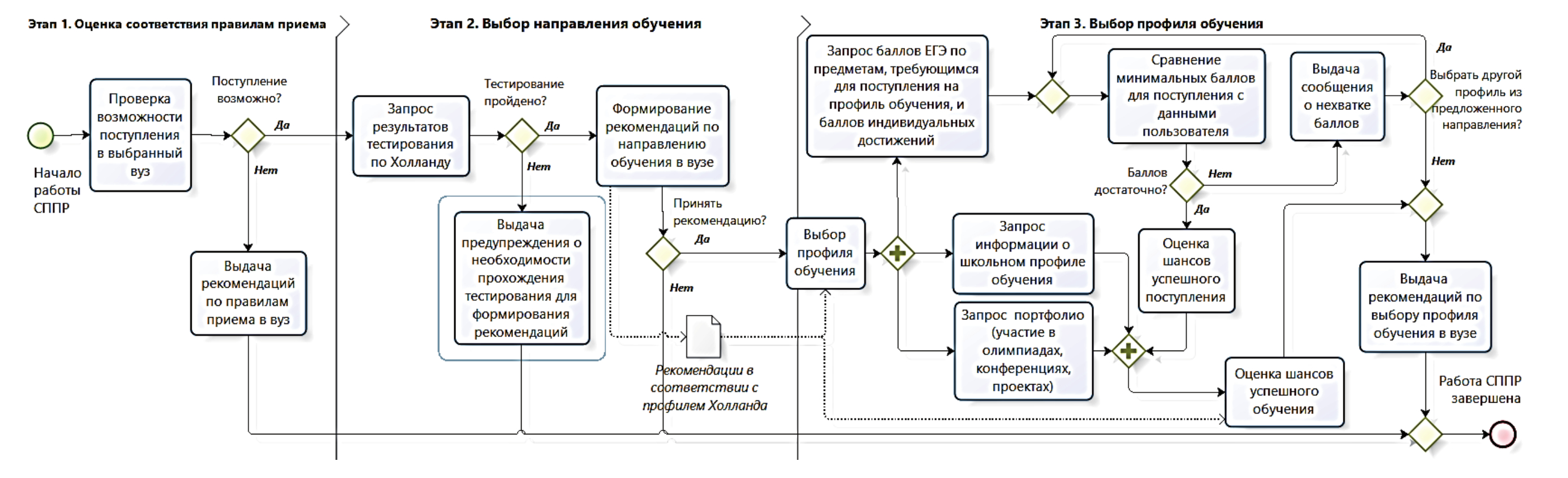 Алгоритм ППР представлен на рисунке 1 в виде процессной диаграммы, на которой выделены этапы выбора профиля обучения.
