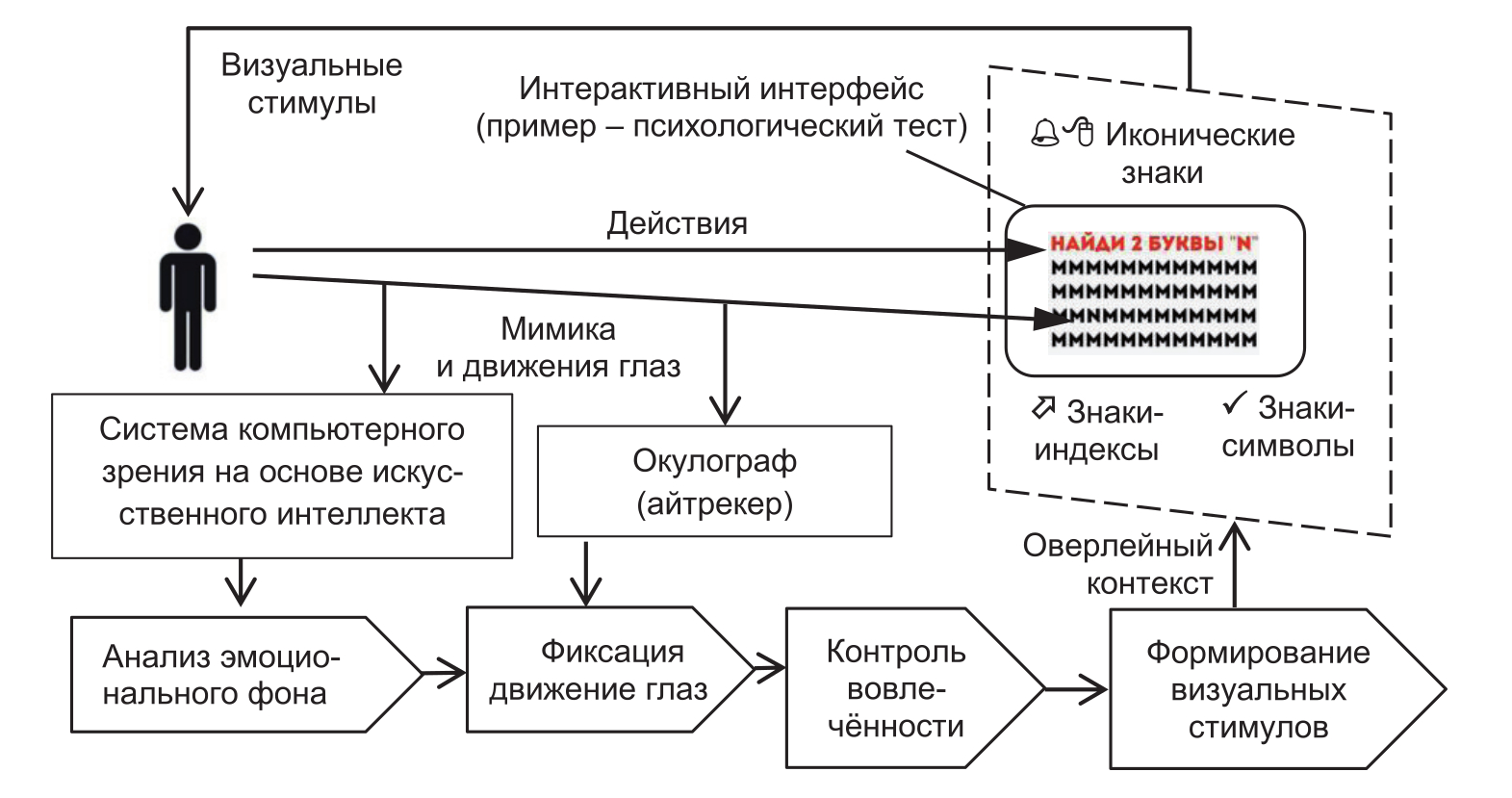 Для управления вниманием пользователя в ИмС необходимо исследовать особенности семиозиса в ИмС [10]. Формирование визуальных стимулов в виде специализированных знаков в составе соответствующей системы управления может быть задано в виде прагматических правил и автоматизировано в базе знаний АПК, формирующей ИмС. Например, в приложениях медицинской диагностики и реабилитации [11, 12] для достижения эффекта персонализированной медицины необходимо сформировать типовую интерпретанту в соответствии с особенностями пользователей и создать визуальный контекст представления воздействующих символов в соответствии с индивидуальными особенностями восприятия.