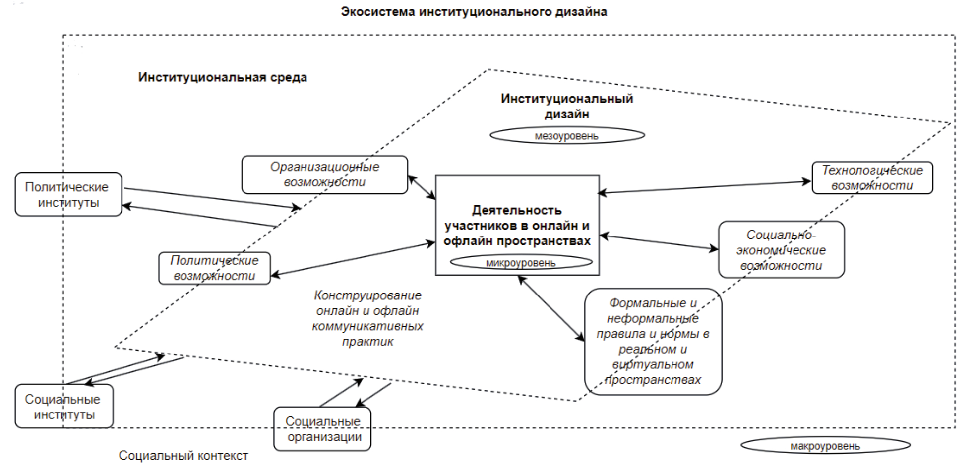 Общественные движения (ОД) являются сложным и многоаспектным феноменом и рассматриваются в качестве «коллективных действий» [1], «протестного поведения» [2], «коллективной инициативы» [3], «технологии воздействия на политику» [4], «сетей взаимодействия между заинтересованными сторонами» [5], «онлайновых и офлайновых сетей отношений между отдельными индивидами, группами, организациями» [6]. Деятельность участников ОД зависит от институциональной среды (ИС), которая представляется в качестве социальных институтов, организаций, формальных и неформальных правил и норм, регулирующих деятельность участников ОД. ОД, как организованные онлайн- и офлайн-сети, формируют институциональный дизайн (ИД), представляющий собой процесс конструирования социальной реальности в соответствии с формальными и неформальными правилами и нормами, возможностями для организации коммуникативных практик (КП). ИД оказывает влияние на активность субъектов социальной деятельности. Методы конструирования реальности, технологии проектирования деятельности ОД, разработка и реализация проектов, выработка стратегий для решения социальных проблем, использование новых технологий для отстаивания своих интересов отражают специфику ИД, на который оказывает влияние социальный контекст, ИС, социальные институты современного общества.