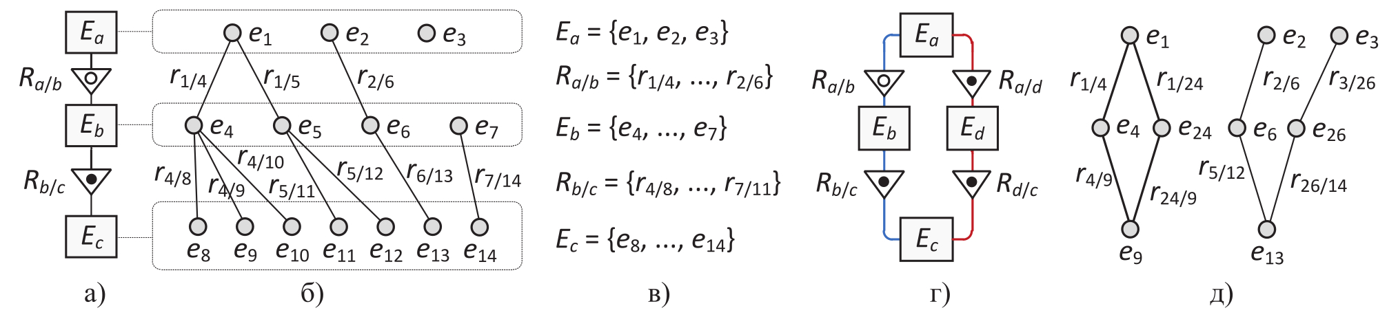 Рисунок 1 – К понятию МП-целостности: а) – пример СС-модели как модели классов; б) – пример экземпляров сущностей и связей; в) – сущности и связи как множества экземпляров; г) – МП-отношение двух ЛВР; д) – экземпляры с несогласованной МП-целостностью