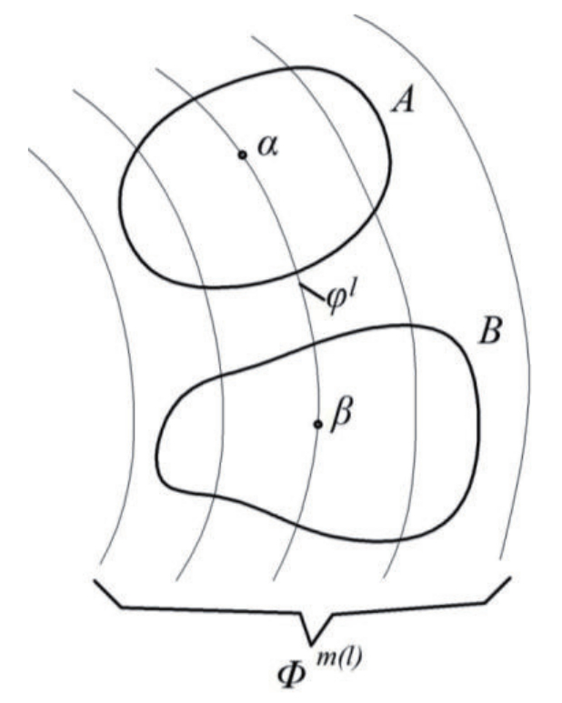 В пространстве En между множествами A и B могут быть установлены различные соответствия, если сопоставить элементу α∈A один или множество элементов β∈B (см. рисунок 1). Сопоставление может быть выполнено конструктивно, т.е. путём соответствующих построений. Пусть пространство En разбито на классы эквивалентности согласно схеме на рисунке 1. Для этого образ β и прообраз α в конструктивном соответствии должны принадлежать одному классу эквивалентности φl, который называется проецирующим классом. При этом под отношением эквивалентности ∆∈ понимается инцидентность элементов α и β одному проецирующему классу φl [13]. При разбиении пространства En на проецирующие классы необходимо выполнение некоторых условий: