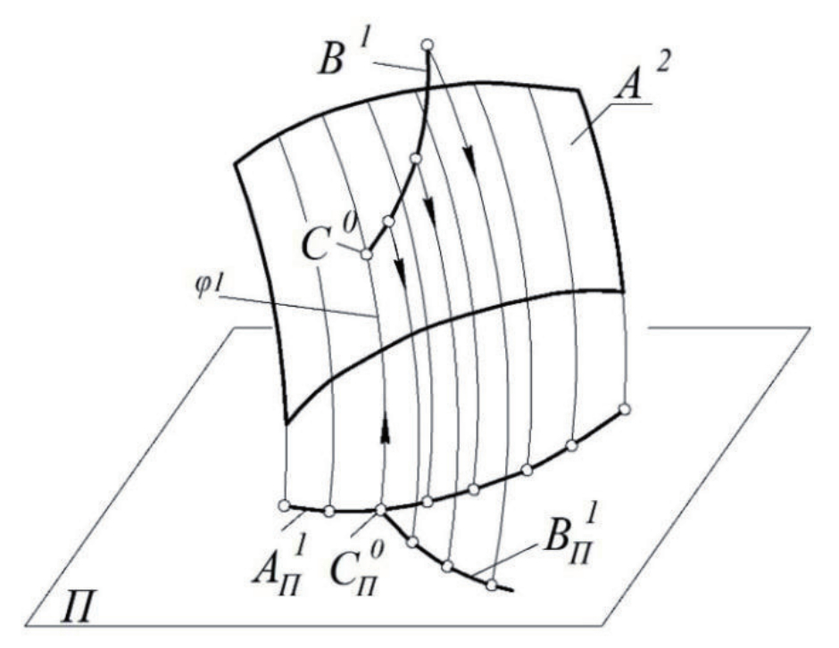 - A2→AΠ1 = CΠ1(0) – след проецирующей поверхности A2 и одновременно φ-проекция искомой линии пересечения C1(0)