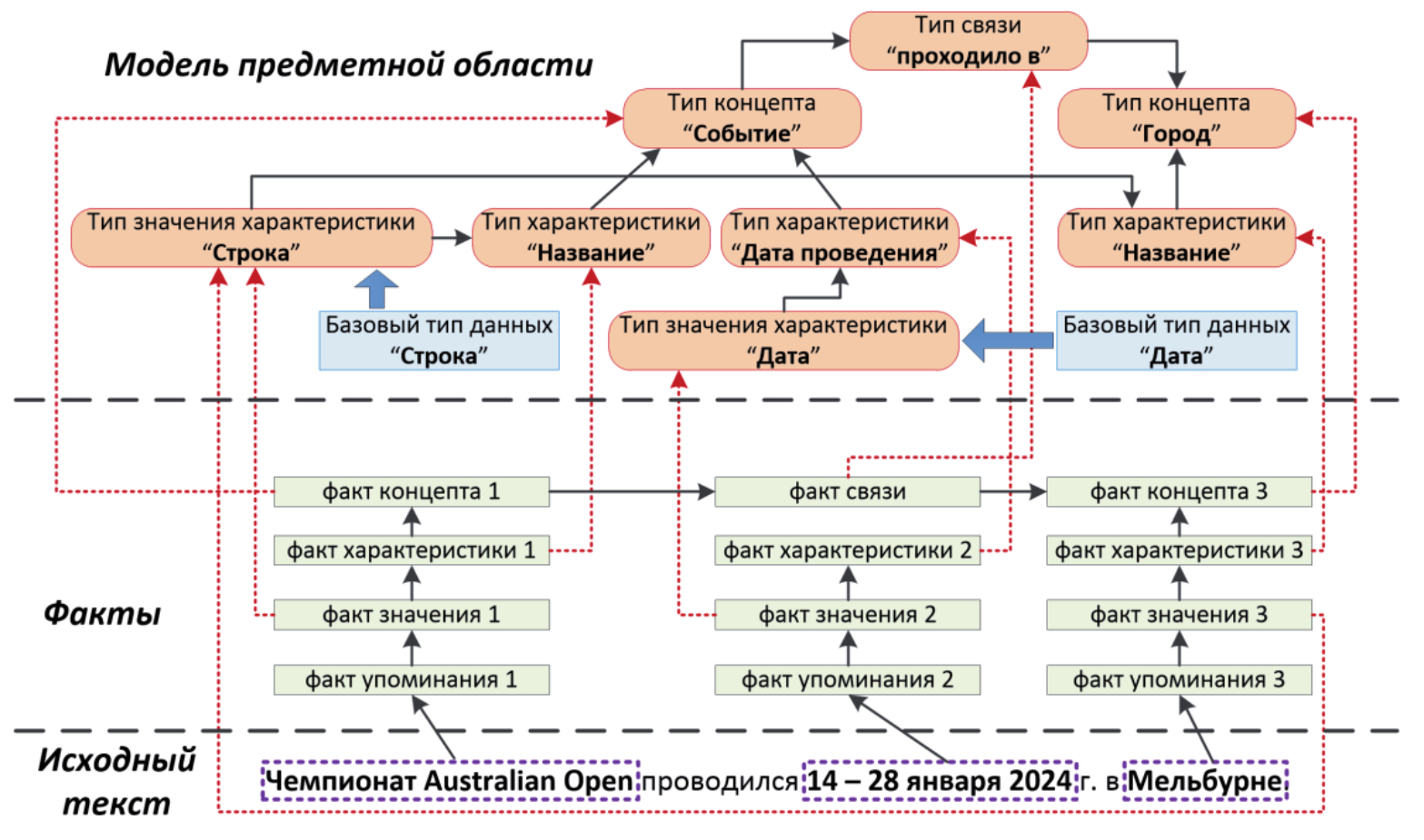 В данной работе предлагается специализировать предложенный общий подход к конкретной практической задаче извлечения фактов из ТД в рамках индустриальной цифровой платформы Talisman22, разработанной Институтом системного программирования имени В.П. Иванникова Российской академии наук (ИСП РАН). Платформа Talisman представляет собой набор связанных программных инструментов для автоматизации типовых задач обработки данных (сбор, интеграция, анализ, хранение, визуализация). Платформа обеспечивает быструю разработку аналитических систем, объединяющих информацию из внутренних баз данных и открытых источников сети Интернет.