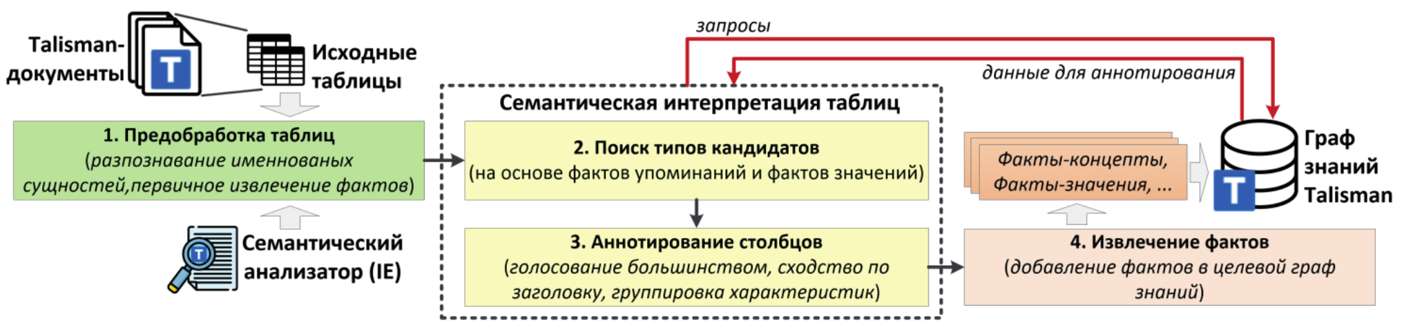 Подход к автоматизированному наполнению ГЗ сущностями на основе анализа таблиц был предложен в [9]. Особенностью этого подхода является возможность автоматического восстановления семантики ТД на основе применения гибридного метода, сочетающего в себе техники машинного обучения, векторных представлений и интуитивно понятных эвристик.