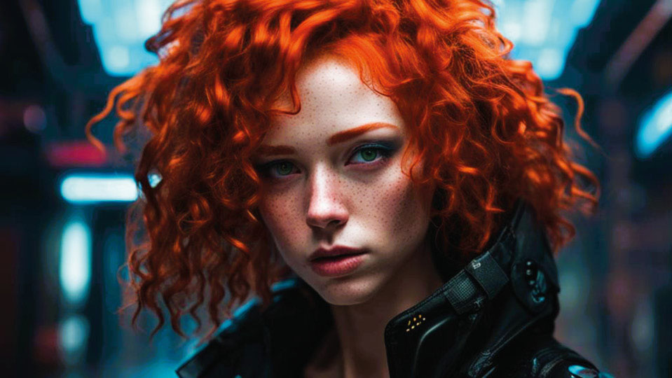 Рис. 1. Вариант визуализации промпта «Серьезная девушка с короткими кудрявыми волосами в кожаной куртке» (источник: нейросеть Kandinsky, стиль: киберпанк)