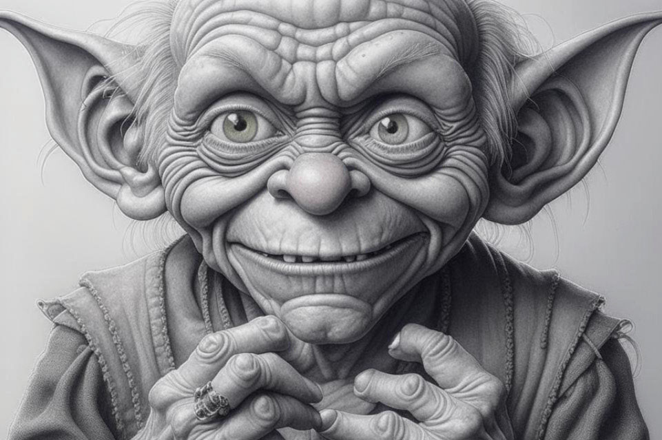 Рис. 2. Нейросетевая визуализация Ехарного Бабая. Промпт «Добрый смешной гоблин» (источник: нейросеть Kandinsky, стиль: рисунок карандашом)