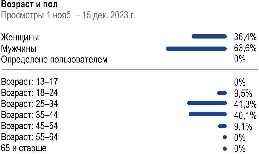 Рис. 3. Пол и возраст целевой аудитории артистки Jennie Moz-Art: данные личного кабинета артиста в «Творческой студии» видеохостинга YouTube с 01.11.2023 по 15.12.2023