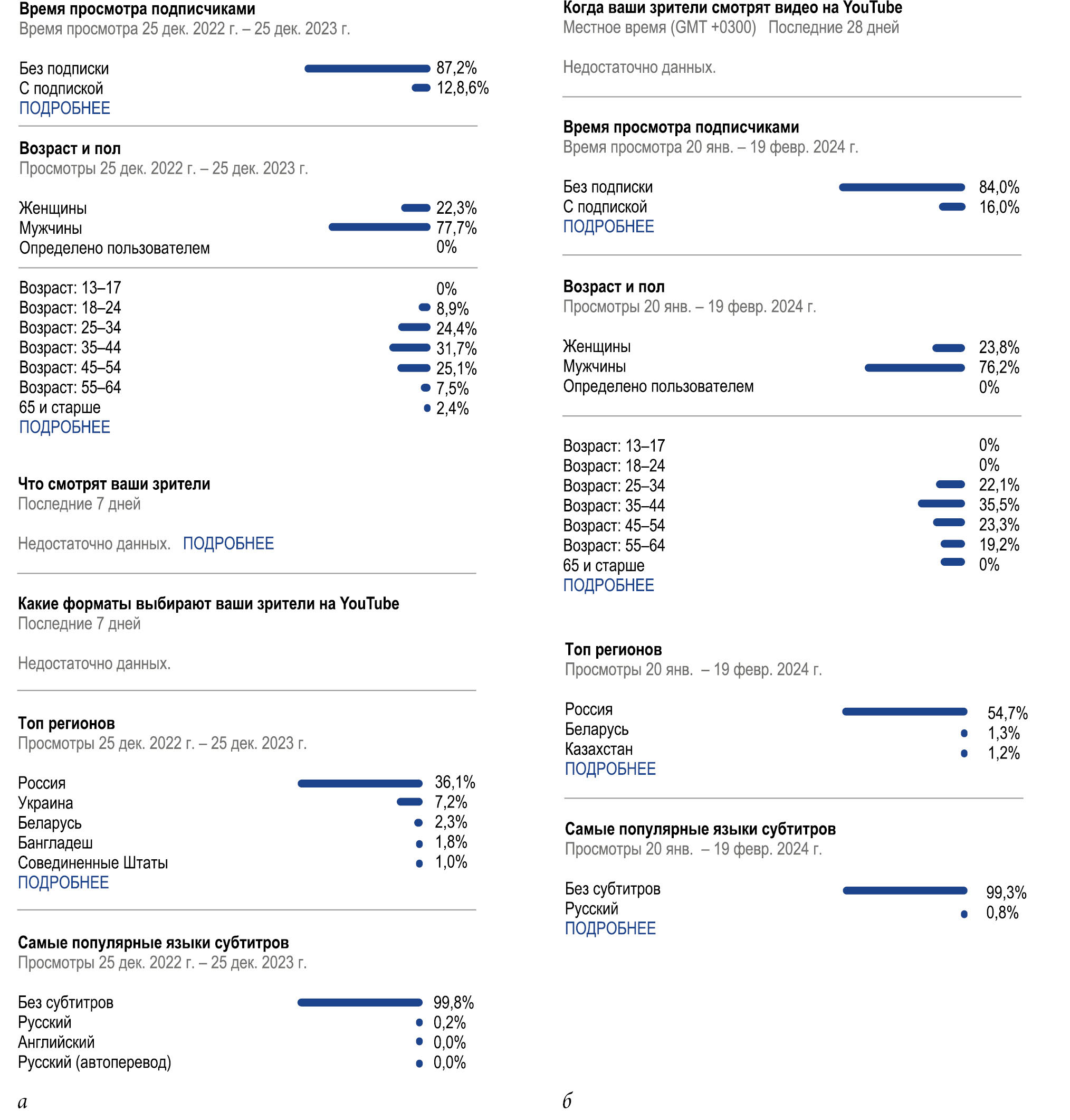 Поскольку в целях чистоты эксперимента ни один продукт нейросетевой генерации не сопровождался таргетированной рекламой, показатели количества просмотров на YouTube для нейросетевого клипа «Виртуальная я» артиста ЕШШКА не позволили алгоритмам YouTube описать пол и возраст аудитории клипа. В этой связи крайнюю левую дату замеров активности аудитории для канала лейбла Media Sharks было решено сдвинуть на один год назад — с 25 декабря 2022 г. по 25 декабря 2023 г. В этот период к контенту лейбла наибольший интерес проявляли зрители мужского пола в возрасте от 35 до 44 лет (31,7% пользователей), чуть менее активны были зрители в возрастных группах от 45 до 54 лет (25,1% пользователей) и молодежь в возрасте от 25 до 34 лет (24,4%). Здесь можно увидеть расширение целевой аудитории артистки Jennie Moz-Art в сторону привлечения внимания более юных зрителей (8,9% дополнительных целевых подписчиков в возрасте от 18 до 24 лет) и более возрастных зрителей (25,1% пользователей в возрасте от 45 до 54 лет и 7,5% пользователей в возрасте от 55 до 64 лет).