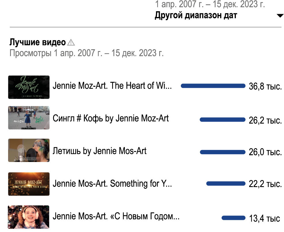 Как видно из приведенных данных, зрительские аудитории каналов Jennie Moz-Art Official и дуэта W&V (рис. 3, 4) в целом совпадают по критерию аватара целевого зрителя/слушателя. Это мужчина в возрасте от 35 до 44 лет, ежедневно или несколько раз в неделю потребляющий развлекательный аудиовизуальный контент с музыкой в стиле инди и инди-рок и увлекающийся изучением новых технологий, включая генеративные нейросети. В отношении предпочтений визуализации контента для такого целевого потребителя была сформулирована гипотеза, представленная в п. 2.1.1 настоящей статьи, о выборе образов героев и цветовой гаммы исходя из популярности единиц контента основного артиста (рис. 5) с дальнейшим уточнением параметров визуализации на основании данных опросов фокус-групп для релевантных категорий респондентов.
