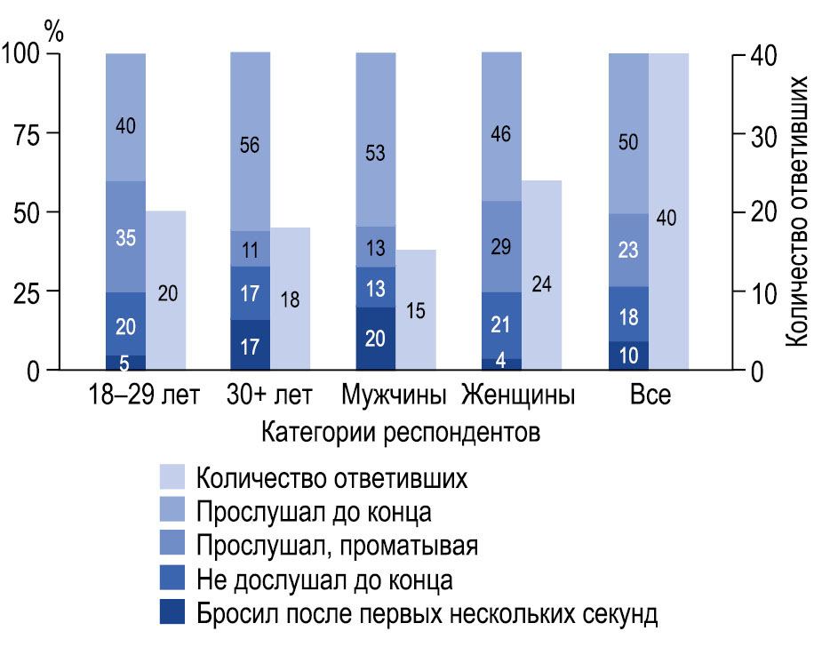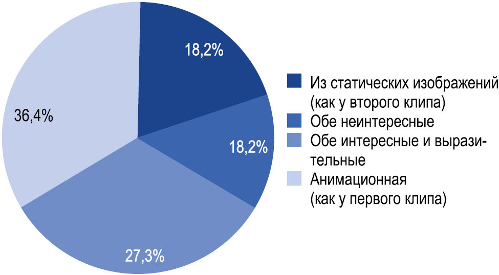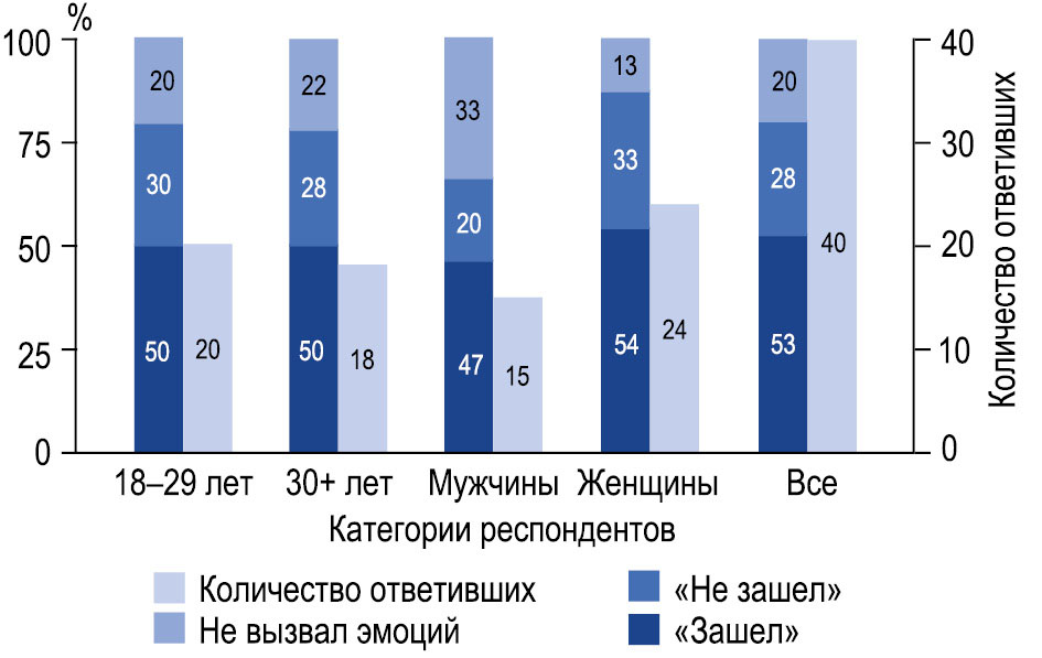 - Опрос фокус-групп по каждому из предложенных медиапродуктов (кроме тестовой песни Jennie Moz-Art «Ешкин кот», для трех опубликованных визуализаций которой собиралась исключительно статистика просмотров на YouTube).