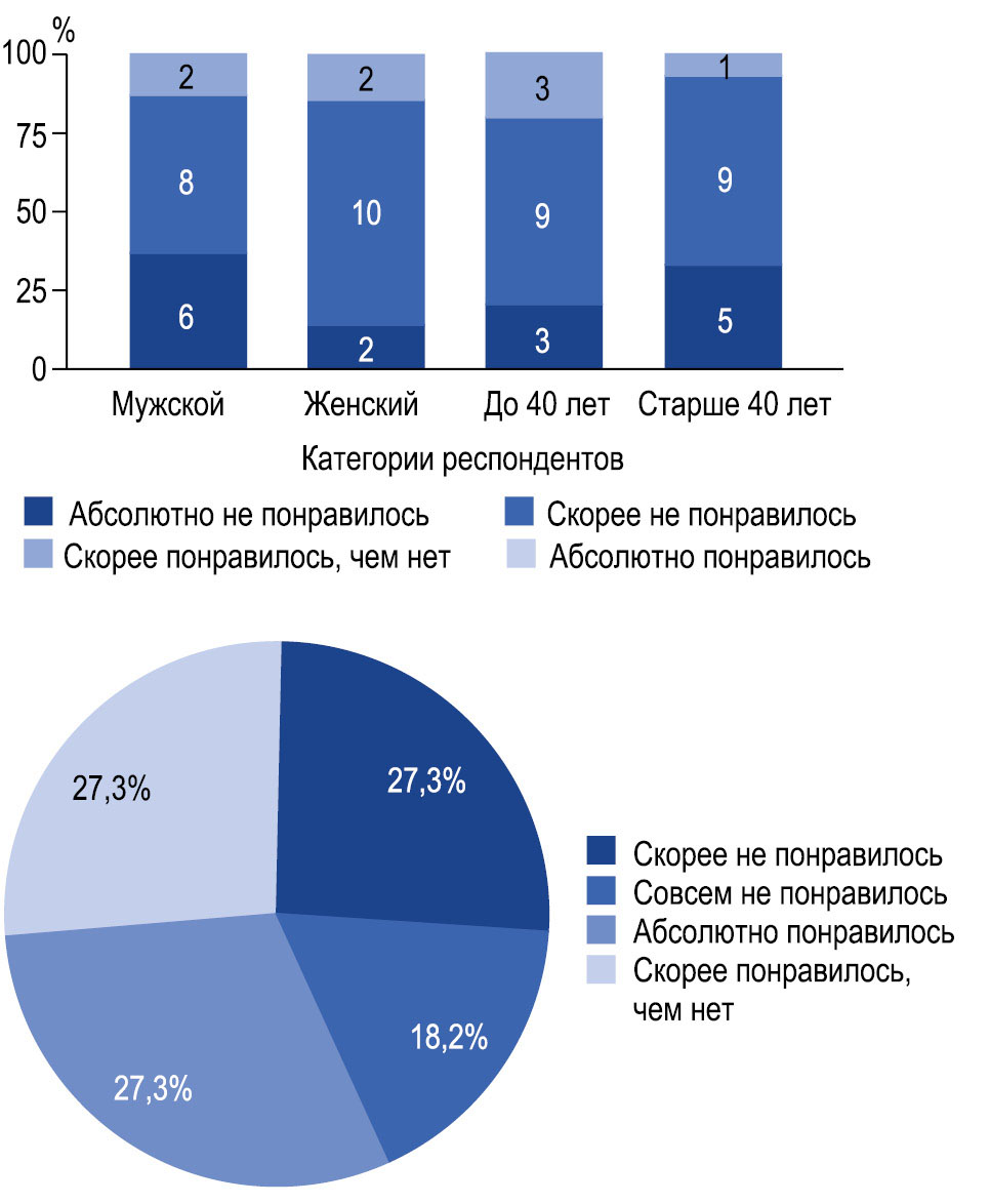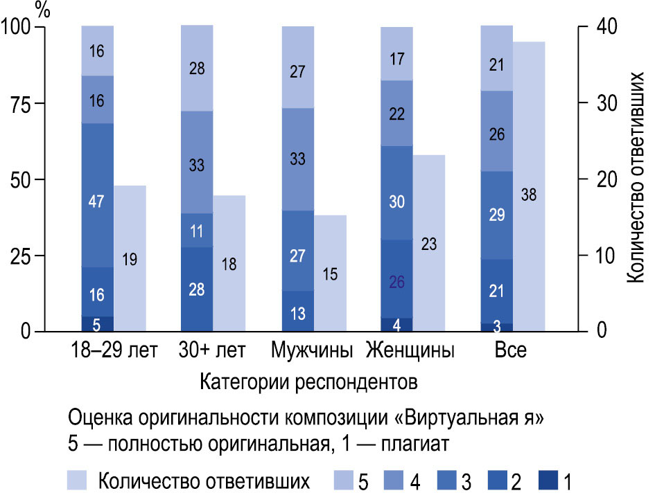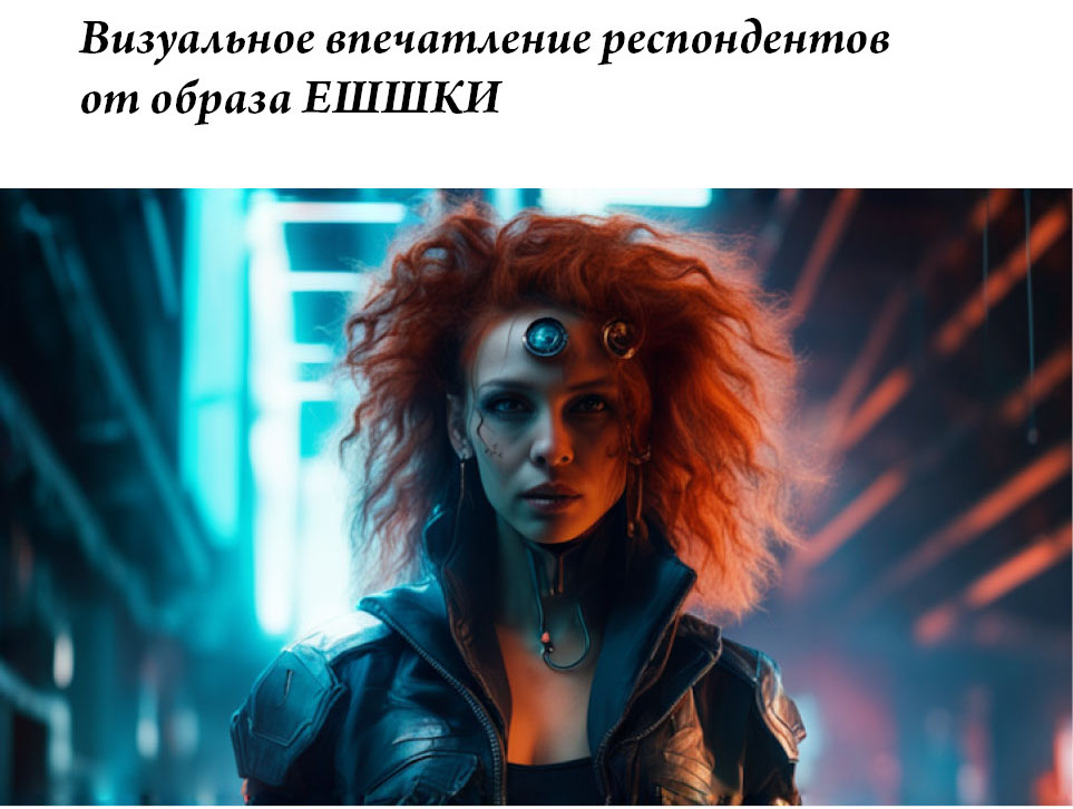 Из инфографики видно, что ядром целевой аудитории артистки Jennie Moz-Art являются мужчины (63,6%) в возрастном диапазоне от 25 до 54 лет и женщины (36,4%) в возрастном диапазоне от 18 до 54 лет. Приняв эти данные за исходные, авторы исследования создали три опроса по продуктам нейросетевой генерации мультфильмов для производных артистов — полунейросетевой-полуантропоморфной певицы ЕШШКА и живого антропоморфного инди-рок-дуэта W&V. Для последующих опросов формирование фокус-группы происходило по принципу добавления к ядру желающих продолжать участие в экспериментах лояльных целевых потребителей новых респондентов, чья профессиональная деятельность и/или музыкальные интересы связаны с инди-музыкой и генеративным искусством. Таким образом, динамика приращения ядра целевых потребителей экспериментального музыкального контента с нейросетевой визуализацией позволяла проанализировать дополнительный параметр — процент удержания лояльности зрителя/слушателя к новым медиапродуктам оцениваемого артиста.
