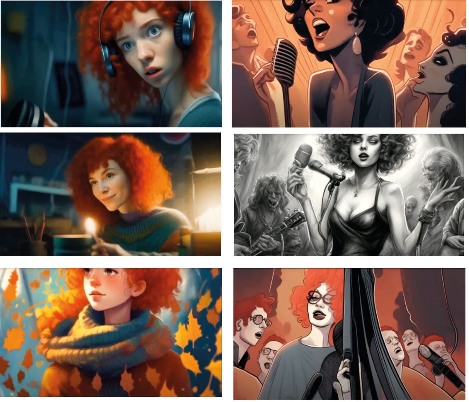 Анализируя визуальный ряд первого официального клипового продукта нейросети Sora на композицию артиста Washed Out “The Hardest Part” [22], следует отметить, что по стилю визуального решения клип приближен к реалистичному видео. Динамичный темпоритм гиперпоп-композиции подчеркивается скоростью движения в микросценах клипа. Любопытная деталь, определяющая узнаваемость применения практик нейросетевого генеративного медиаискусства в создании клипа — образ главной героини, задаваемый по промпту: «Симпатичная рыжая кудрявая девушка». Похожий тиражируемый образ визуализации персонажей женского пола встретится далее по тексту статьи в описании нейросетевого клипа на песню «Кукла колдуна» группы «Король и шут», созданного с применением нейросети Stable Diffusion, и обнаружит портретные сходства с образом артиста Jennie Moz-Art и сквозного персонажа ведьмы в нейросетевых клиповых экспериментах авторов исследования. За девять дней с даты релиза на видеохостинге YouTube нейросетевой клип к песне “The Hardest Part” собрал 204 543 просмотра и 4300 лайков от пользователей видеохостинга при общем количестве 40 800 подписчиков на канале артиста Washed Out.