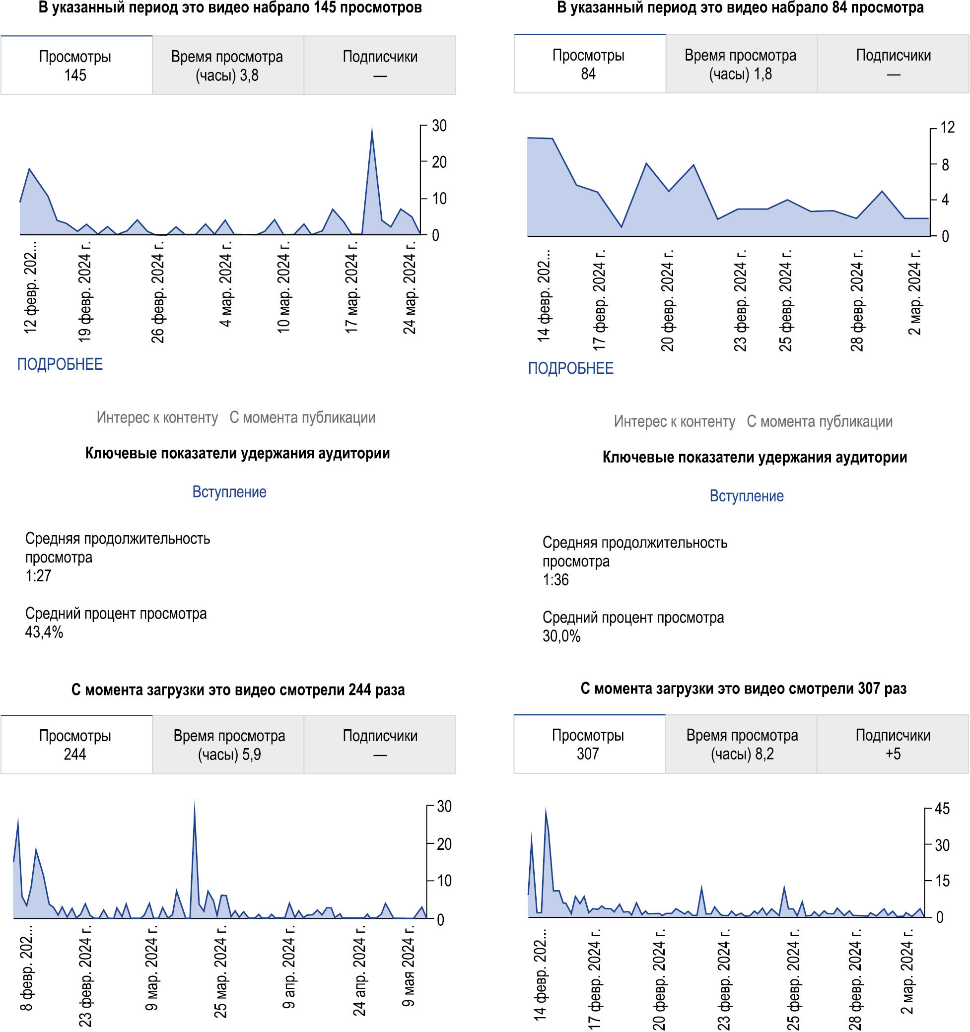 Финальный этап аудита результатов эксперимента имеет два сценария: синхронный и диахронический. Синхронный сценарий аудита результатов эксперимента представляет собой еженедельный сбор статистики прослушиваний композиций артистов на стриминг-сервисах Apple Music и VK Music параллельно с анализом данных за соответствующий период на YouTube. В контексте экспериментальной части исследования достаточными для выводов будут данные, собранные из «Творческих студий» личных кабинетов артистов на видеохостинге YouTube. Диахронический сценарий аудита представляет собой поквартальное сравнение динамики статистических показателей просмотров нейросетевых клипов к песням артистов на YouTube с данными отчетов о платных стримах, получаемых лейблом Media Sharks раз в три месяца в соответствии со сроками налогово-отчетных периодов от дистрибьютора — Believe Digital. В настоящий момент ввиду доступности данных отчета о дистрибьюции за четвертый квартал 2023 г. и прогнозируемости времени доступности отчета о дистрибьюции за первый квартал 2024 г. ближе к началу мая 2024 г. в настоящей статье будут отражены только результаты синхронного аудита.