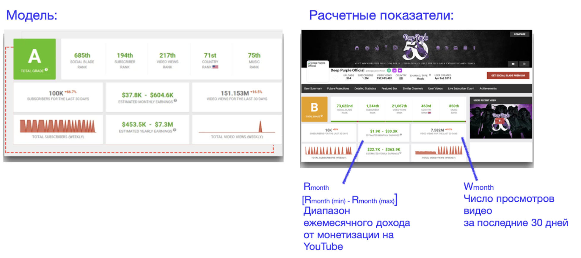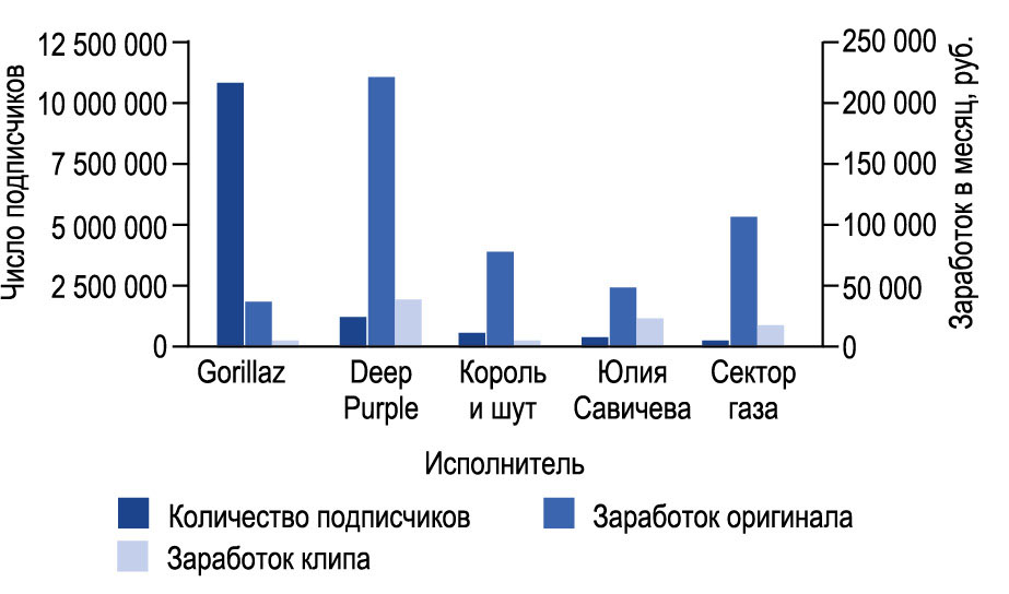 - Сравнение количественных показателей клипов, участвующих в эксперименте, с эталонными медийными артистами, имеющими опубликованные клипы, созданные с применением нейросетевой визуализации («Сектор Газа», “Deep Purple”, «Король и шут»), и расчет сравнительных коэффициентов отклика подписчиков по параметрам количества просмотров/лайков/комментариев.