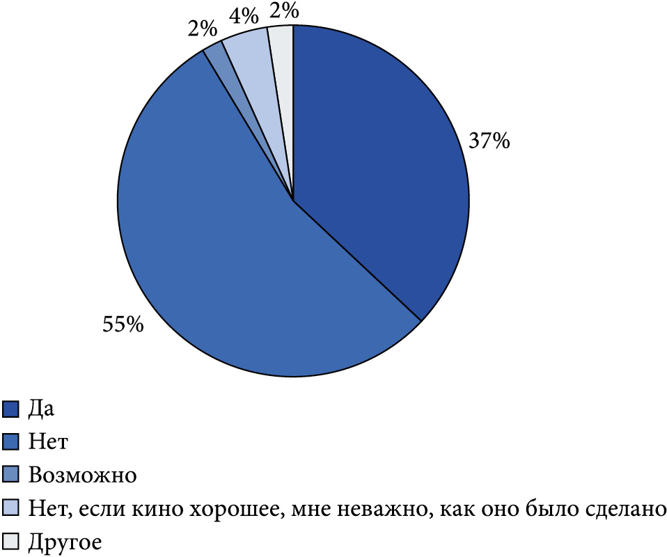 Когда авторы настоящего исследования предложили респондентам рассмотреть обратную ситуацию (они уже посмотрели фильм, не зная о том, что он был создан ИИ, и он им понравился), результаты опроса показали, что для большинства данный факт не будет иметь определяющего значения при оценке качества фильма (диаграмма 2).