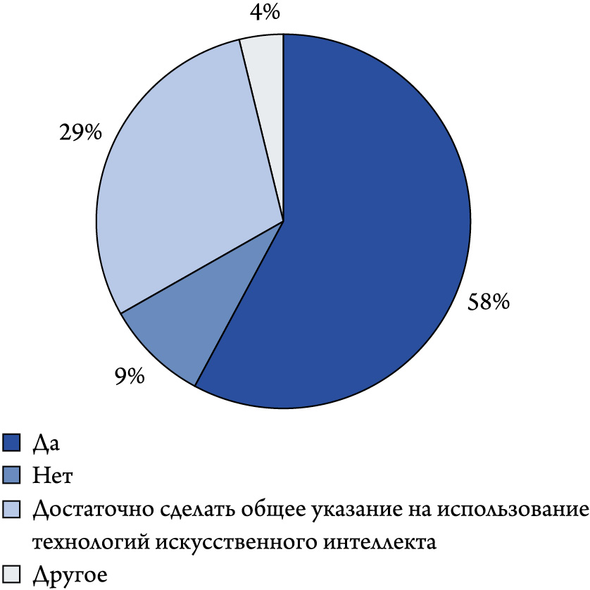Вопрос 4 задан так: «Нужно ли при создании объекта интеллектуальной собственности с помощью технологий искусственного интеллекта указывать, какие именно технологические решения были использованы?». Варианты ответов: а) да; б) нет; в) достаточно сделать общее указание на искусственный интеллект; г) другое.