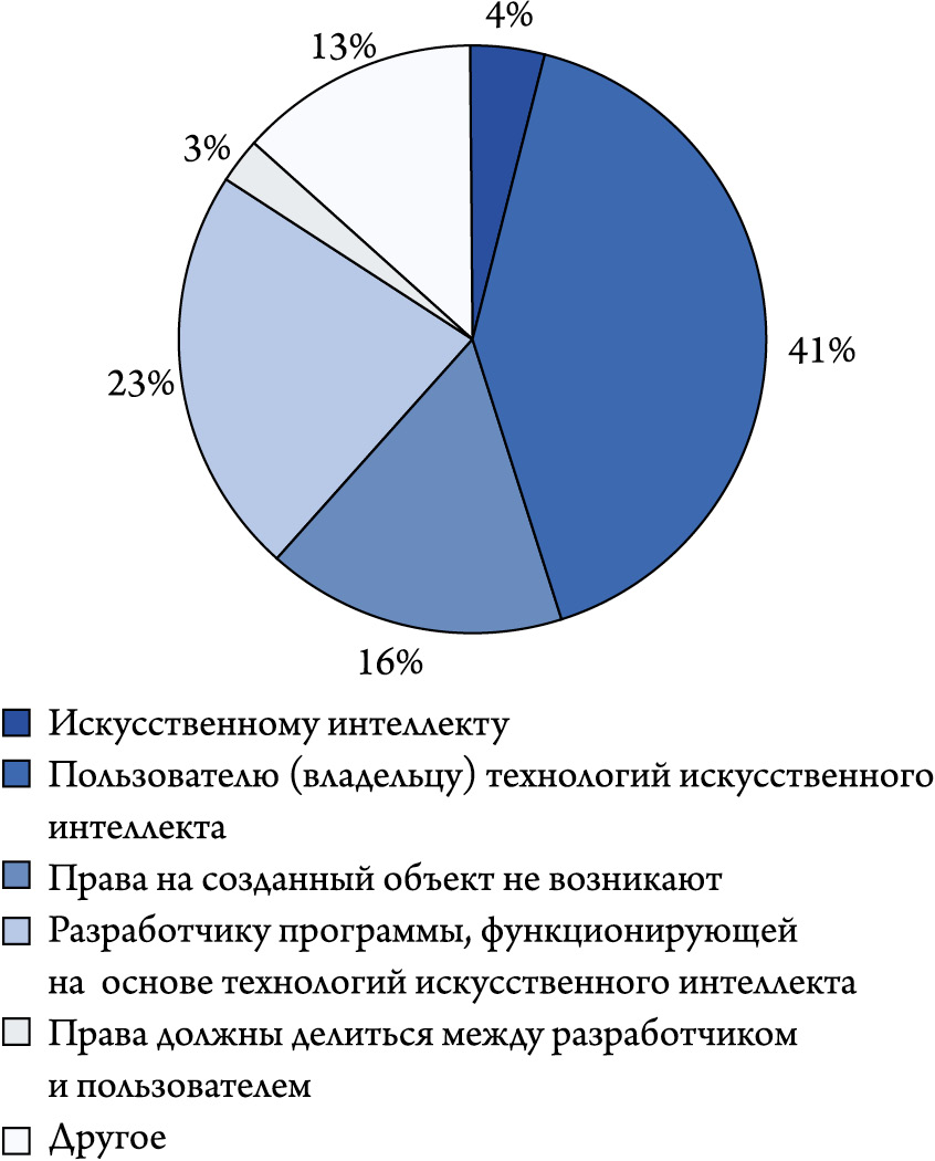 Вопрос 5: «Кому должны принадлежать права на произведение, созданное программой, функционирующей на основе технологий искусственного интеллекта?». Опции ответов: а) искусственному интеллекту; б) пользователю (владельцу) технологий искусственного интеллекта; в) право на созданный объект не возникает; г) разработчику программы, функционирующей на основе технологий искусственного интеллекта; д) права должны делиться между разработчиком и пользователем; е) другое.