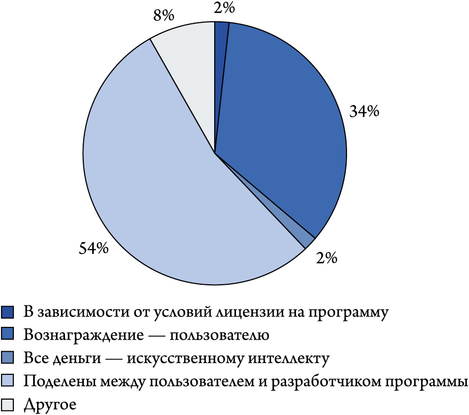 Вопрос 7 был поставлен следующим образом: «Компания разработала программу для создания музыкальных композиций, функционирующую на основе технологий искусственного интеллекта. Пользователь начинает играть мелодию, а программа генерирует ее продолжение. Как должны распределяться доходы от коммерциализации получившейся композиции?». Варианты ответов: а) в зависимости от условий лицензий на программу; б) вознаграждение — пользователю; в) все деньги — искусственному интеллекту; г) поделены между пользователем и разработчиком программы; д) другое.