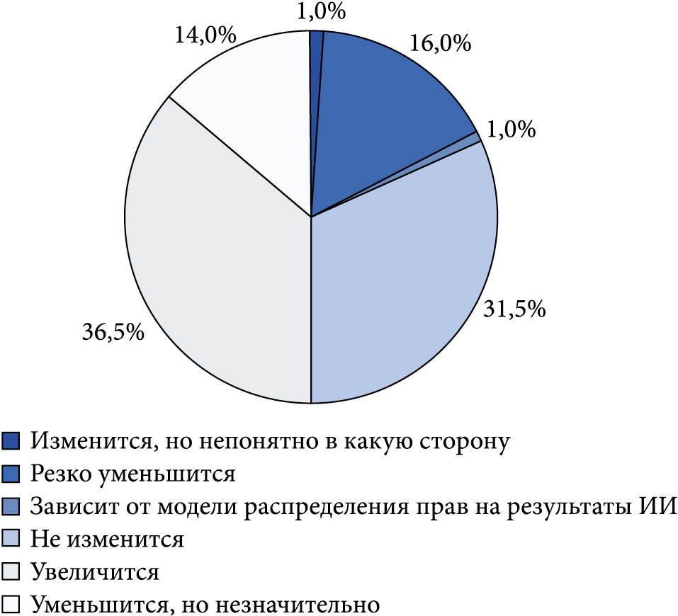 При этом в профессиональном сообществе на нынешнем этапе доминирует подход, согласно которому ИИ в творческой деятельности может пока выступать только как инструмент, а не как полноценный субъект интеллектуальной деятельности (хотя каждый третий респондент не исключает такой возможности в будущем). На практике это означает, что эксперты не ждут в ближайшей перспективе принципиальных изменений в антропоцентристском подходе Бернской конвенции и ГК РФ к вопросу об авторстве. Согласно этому подходу, автором результата интеллектуальной деятельности признается гражданин, творческим трудом которого создан такой результат (ч. 1 ст. 1228 ГК РФ).