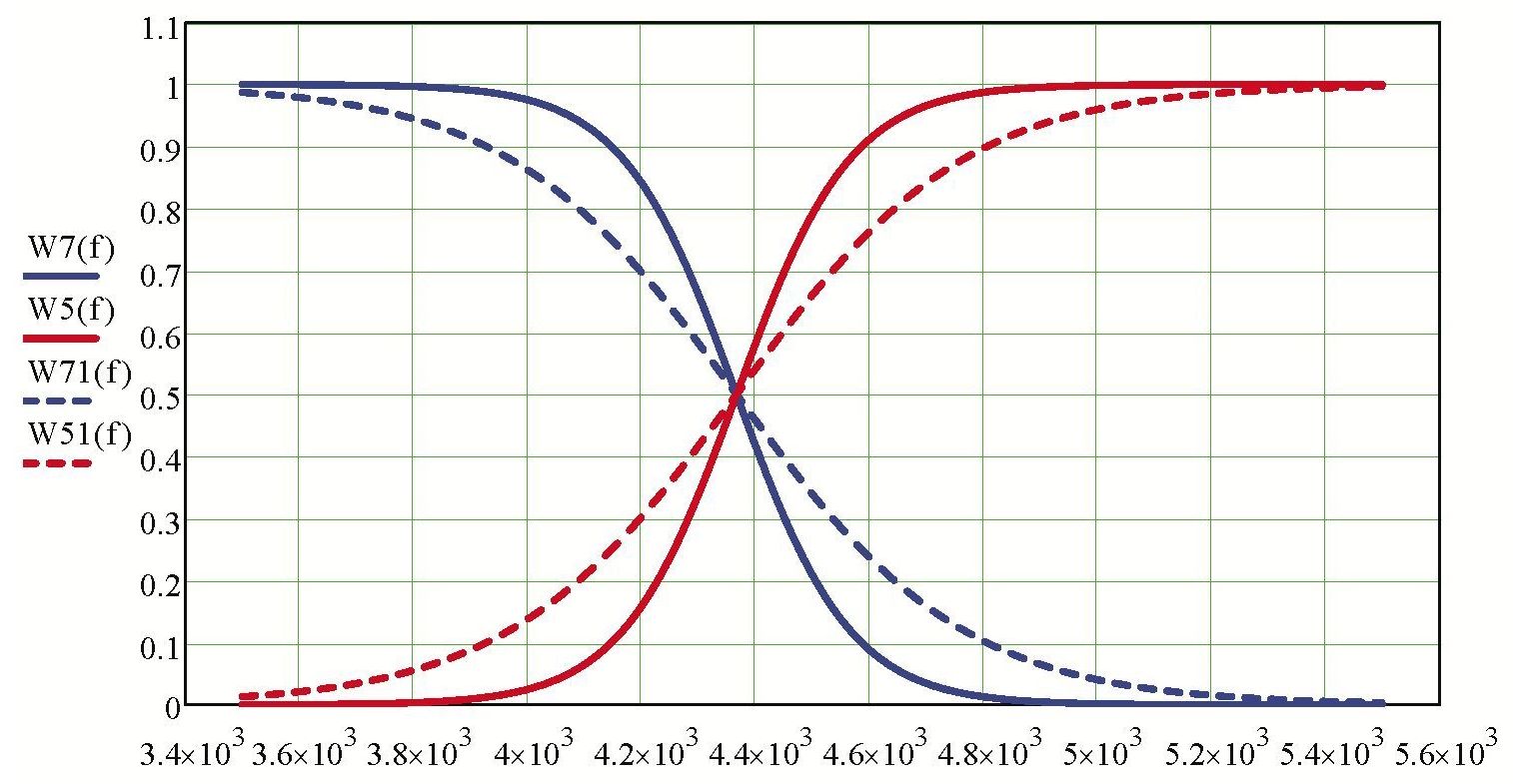 Для иллюстрации метода коррекции ДН примем, что фильтры построены по принципу компенсаторного дополнения сигналов, так что спад частотной характеристики фильтра предыдущего поддиапазона компенсируется подъемом характеристики последующего поддиапазона. Выражения АЧХ таких фильтров на границах поддиапазонов можно аппроксимировать следующими функциями