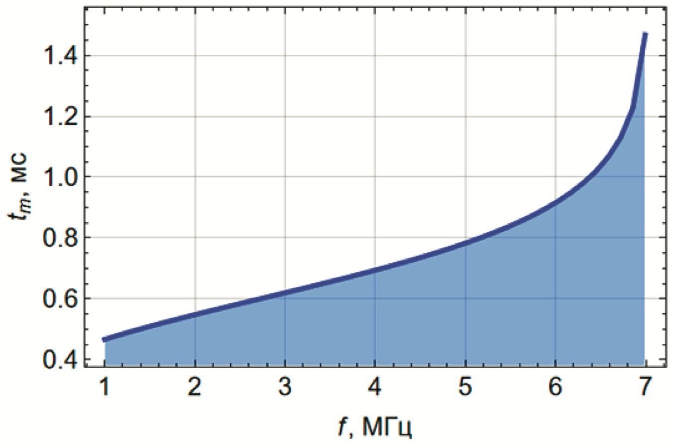 Рис. 8. Время прихода луча tm в точку отражения от ионосферы как функция частоты f.