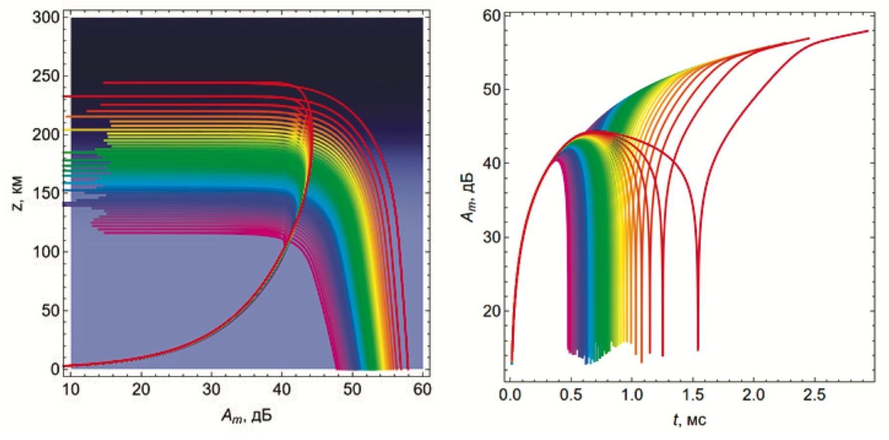 Основным отличием амплитудного метода восстановления эффективной частоты соударений электронов на слабонаклонных трассах от такого же подхода в случае вертикального зондирования [17–19] является необходимость определения всех лучей, пришедших из передатчика в приёмник, то есть решения задачи «пристрелки». Результат решения этой задачи показан на рис. 1. Предполагалось, что угол .
