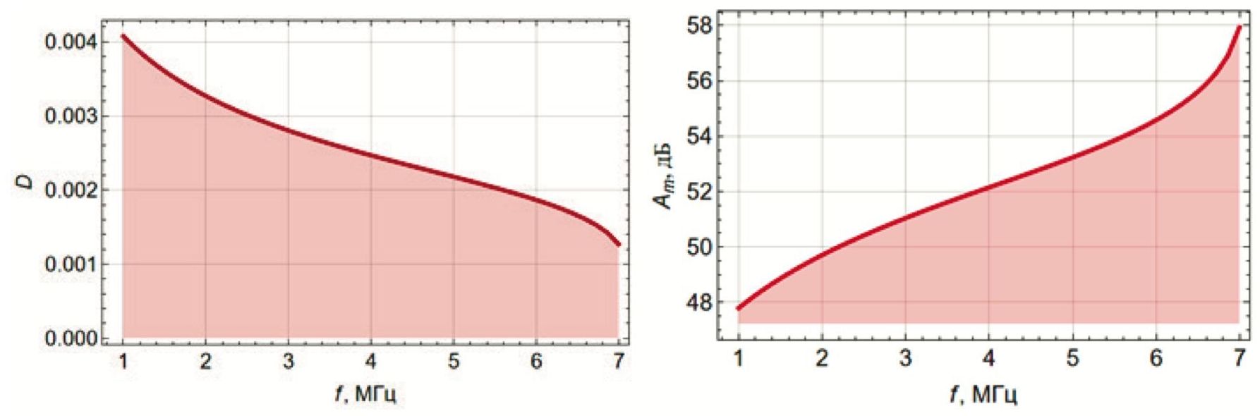 Рис. 10. Зависимости от частоты f: а — расходимости D, б — ослабления радиосигнала Am.