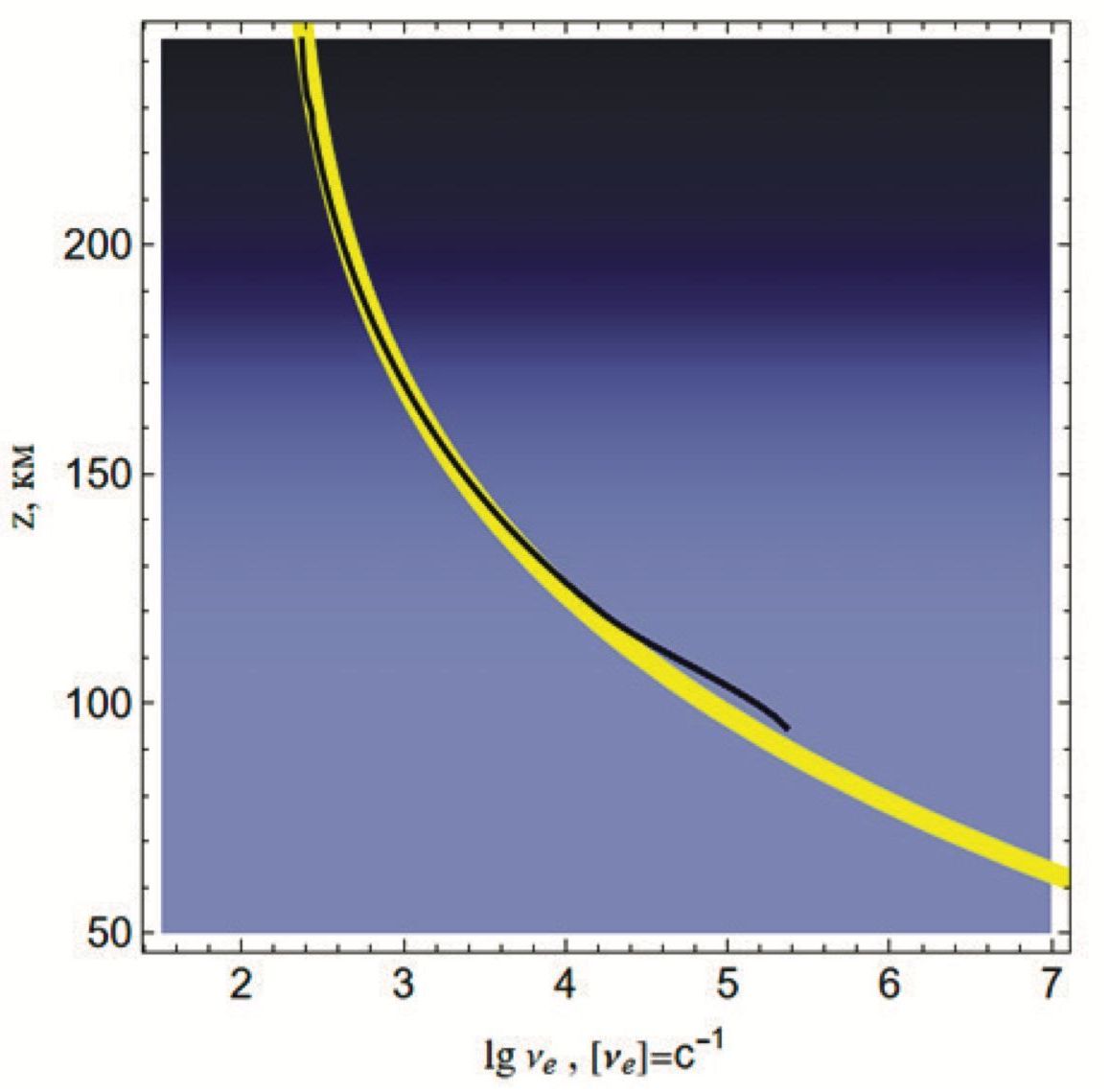 Результат восстановления высотного профиля эффективной частоты соударений электронов показан чёрной линией на рис. 14. Жёлтой широкой линией показан исходный профиль эффективной частоты соударений электронов. Видно, что на высотах более 100 км результат реконструкции показывает приемлемую точность.