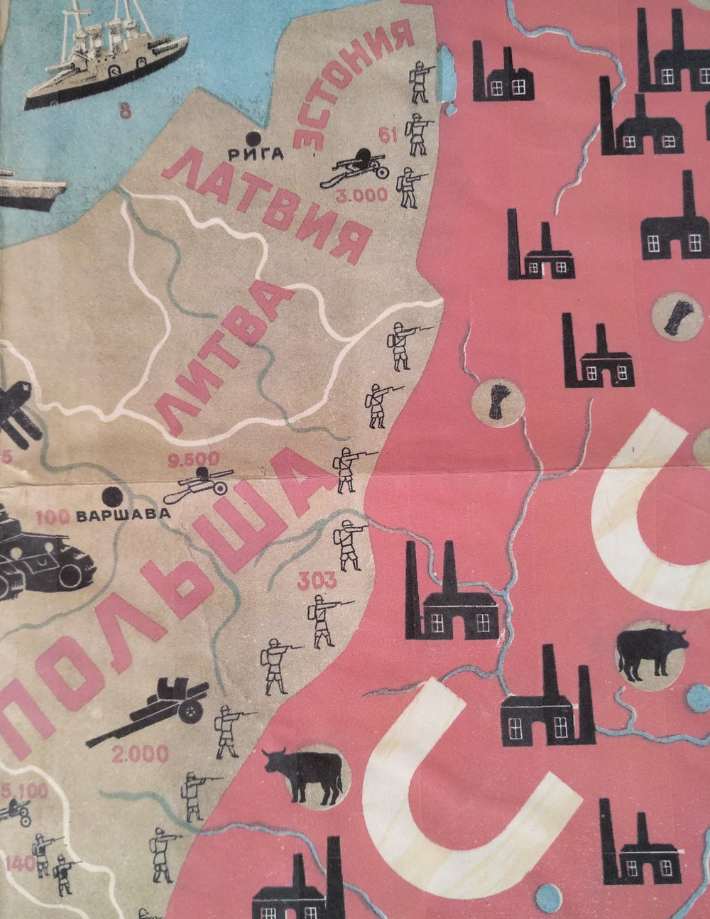 Идея усиления роли границ и необходимость противопоставить СССР остальному миру проявились в ряде визуальных приемов оформления карт. Основной частью книги-плаката «Как вооружены капиталисты» [Жуков, 1931] является карта-схема, демонстрирующая с помощью символов состав вооружений крупнейших стран Европы и САСШ. При этом на территории СССР располагаются только значки коровы, снопа и завода, визуализирующие мирный сельскохозяйственный и промышленный потенциал, а на протяжении всей внешней стороны границы размещены значки вражеских солдат, направляющих оружие в сторону СССР. На политической карте мира 1937 г. [Мир 1937] значимость разного рода границ акцентирована в легенде, включающей целых 8 обозначений в отличие, например, от карт 1929 г., где для типологии границ использовано от 1 до 4 обозначений [Силищенский 1929]. Еще одним приемом стало дифференцирование цвета значков: «...чтобы подчеркнуть детям коренное отличие нашего социалистического государства от всего остального капиталистического мира, для обозначения столиц и городов капиталистических государств дать пунсоны совершенно иного цвета» [Эрдели 1939, 111].