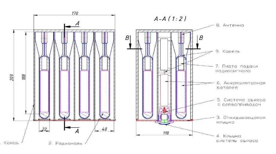- подвесной модуль кассетного типа для хранения и сброса радиомаяков, укомплектованный радиомаяками.