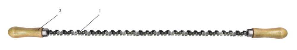 Цепное устройство для кольцевания деревьев (рис. 5) создано на основе использования пильной цепи 1 для поперечной распиловки (например, пильные цепи марок ПЦП или ПЦУ) и имеет две ручки 2, которые прочно прикреплены к свободным концам цепной пилы [24].
