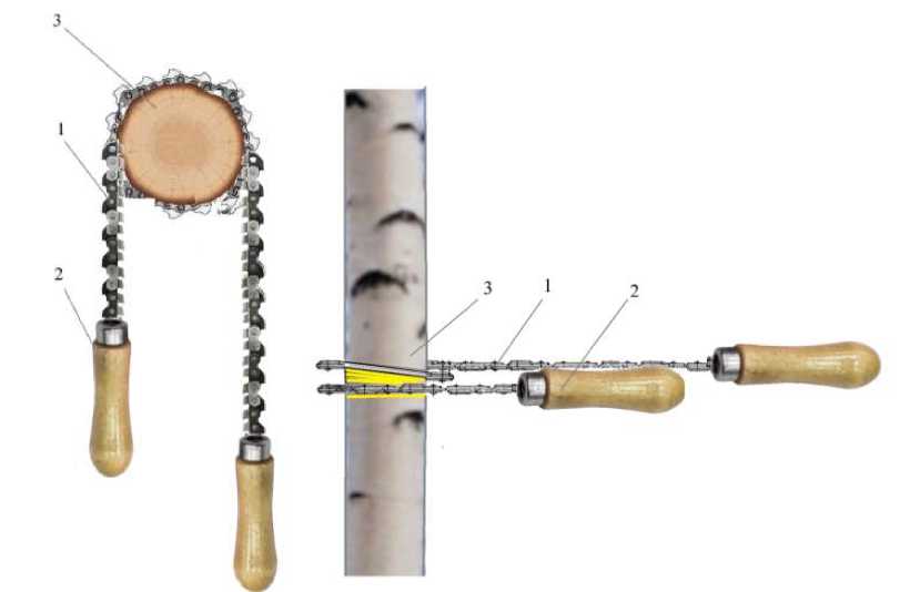 Fig. 6. Interaction of the chain device for tree ringing with the tree to be removed: 1 – cutting body, 2 – handles, 3 – growing tree